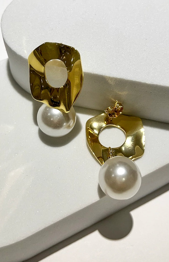 The Divine Connection Pearl Gold Earrings add a touch of elegance with a simple click! These shiny gold round setting with pearl charm at the bottom.