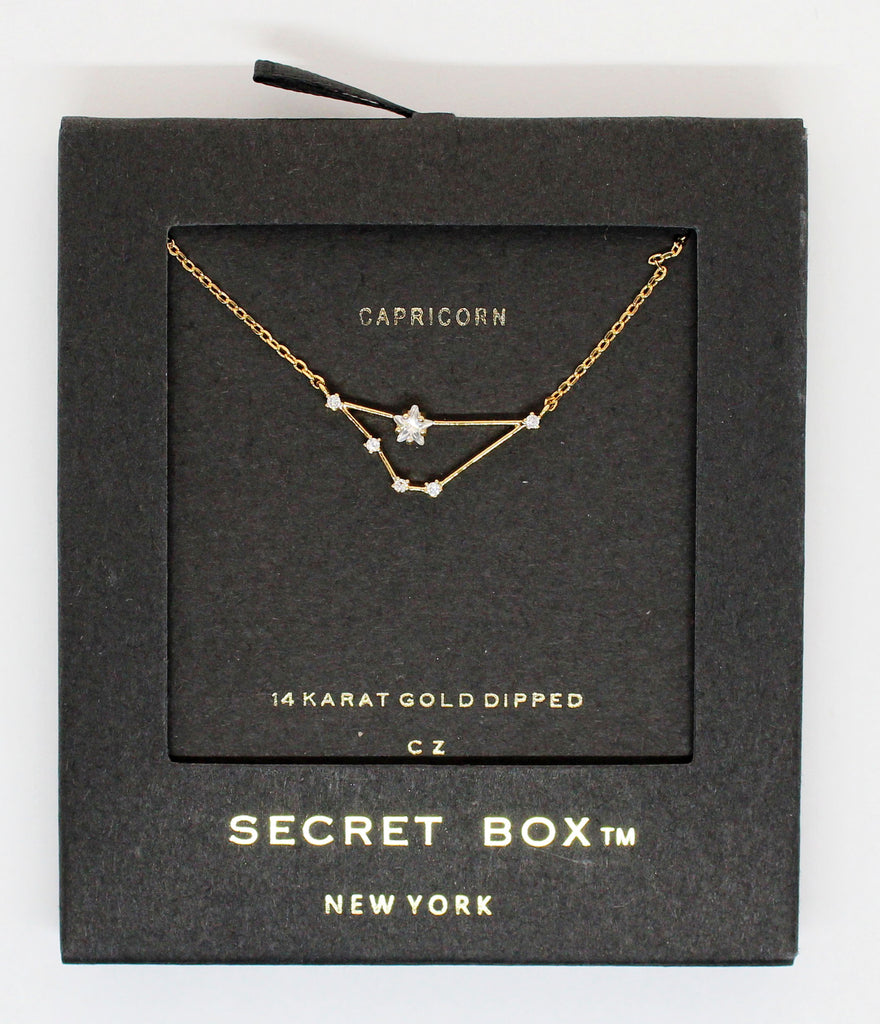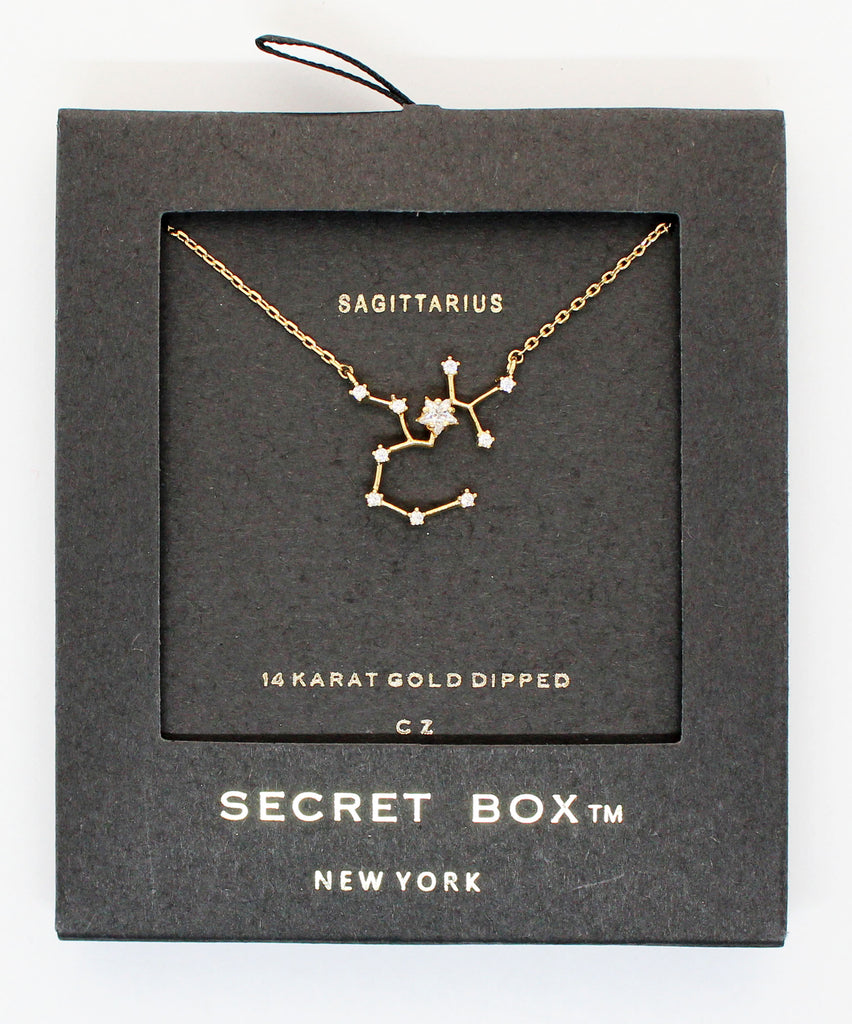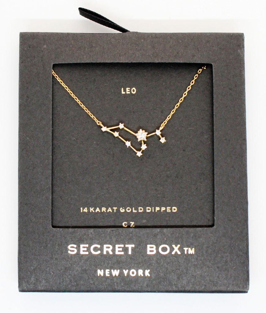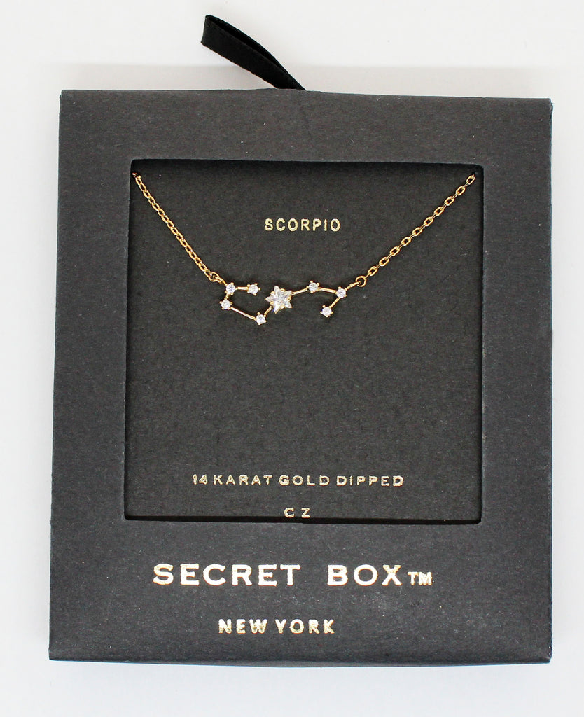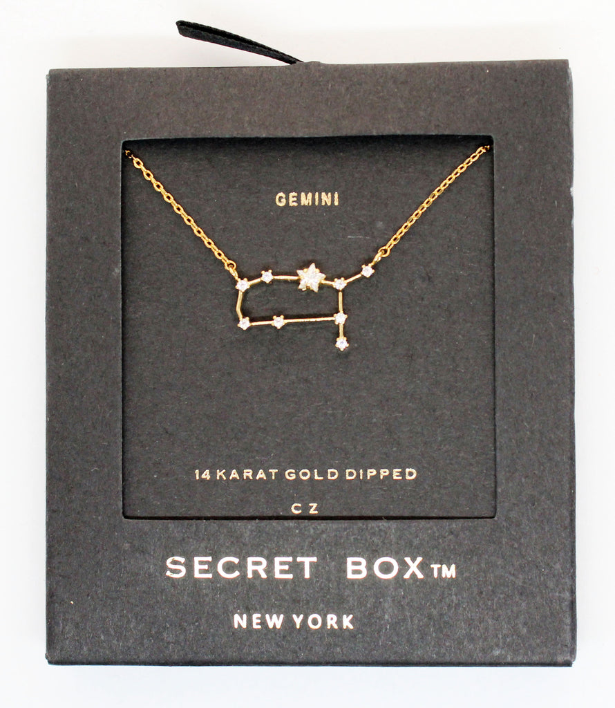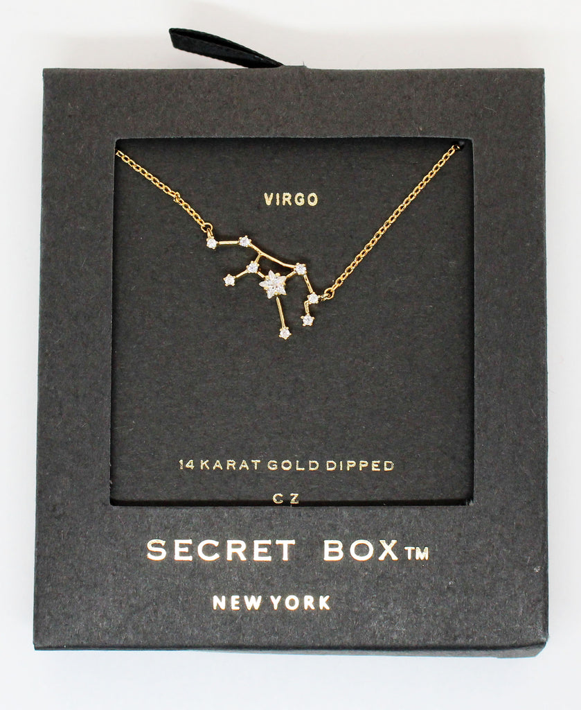 Identify your Zodiac Sigh with Horoscopes Secret Box Necklace! Simple and lightweight Zodiac Stars in 14 karat gold dipped and rhinestones Necklace are delicate & beautiful.