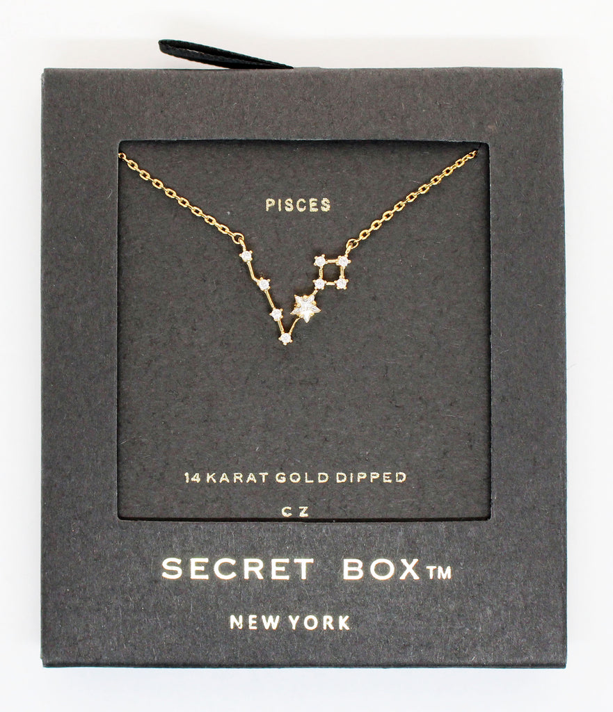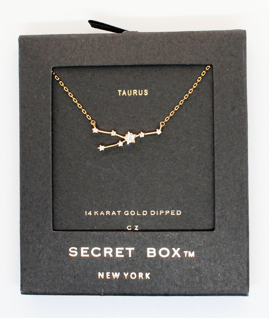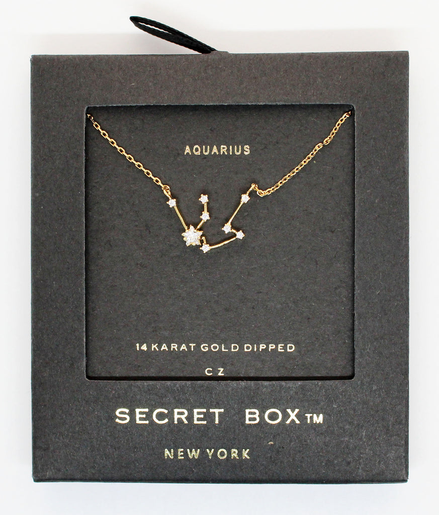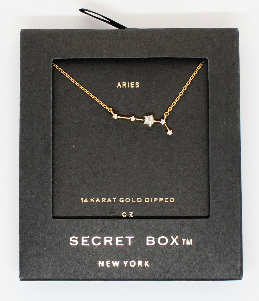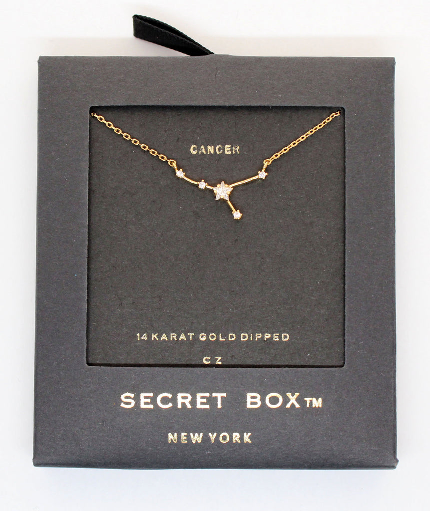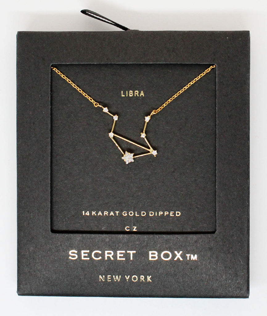 Identify your Zodiac Sigh with Horoscopes Secret Box Necklace! Simple and lightweight Zodiac Stars in 14 karat gold dipped and rhinestones Necklace are delicate & beautiful.
