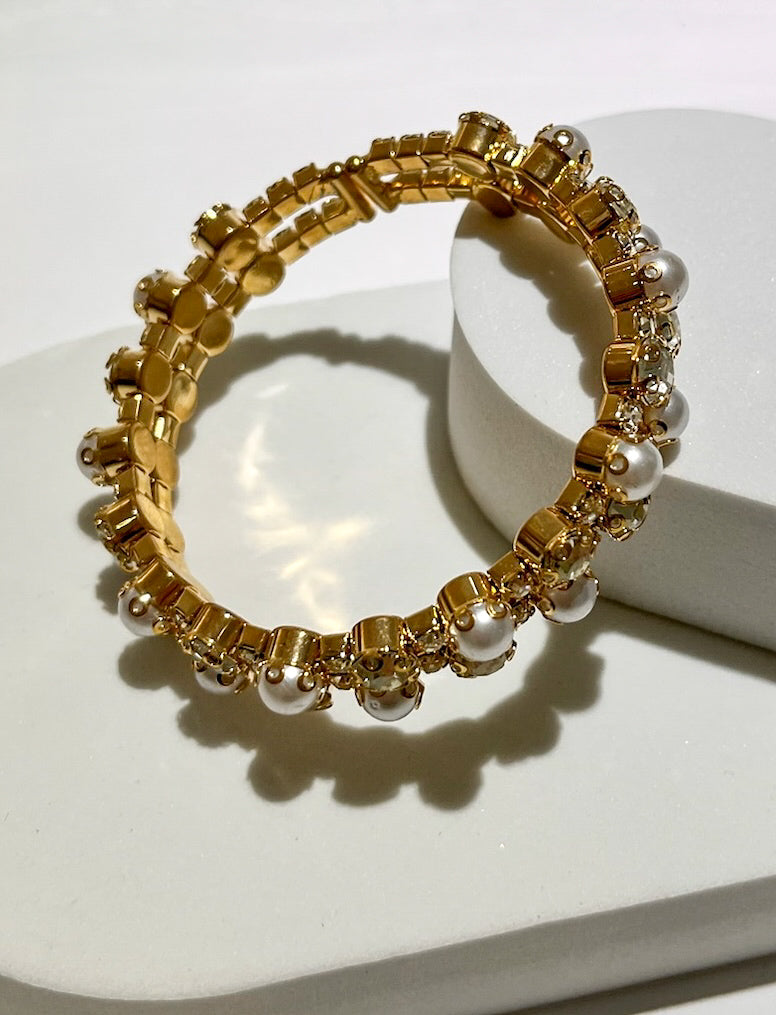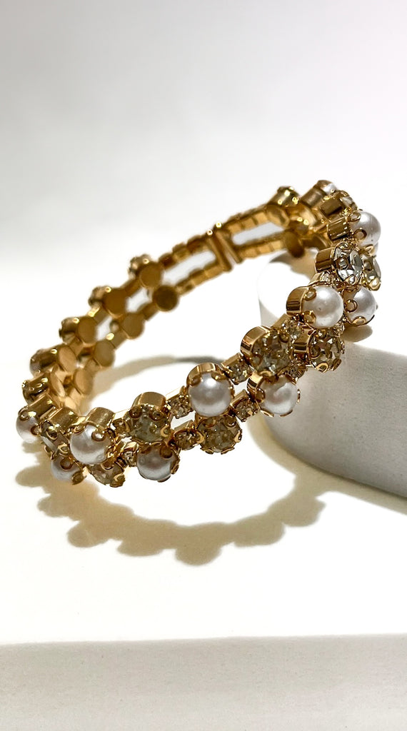 Shiny gold-toned metal shape this luxurious bracelet that casually boasts a cuff-style design composed of gleaming faux pearls, outlined by sparkling rhinestones.