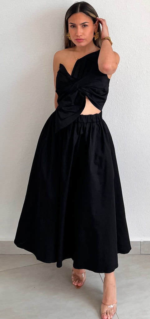 featuring One-Shoulder Flower Top with High Waist Midi Flare Skirt with Pockets.