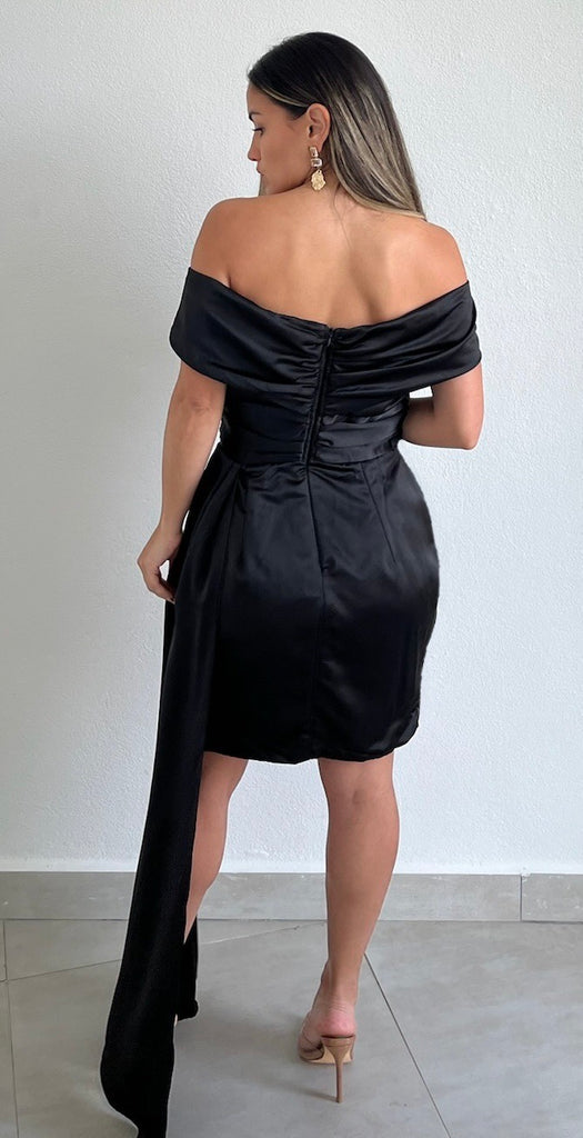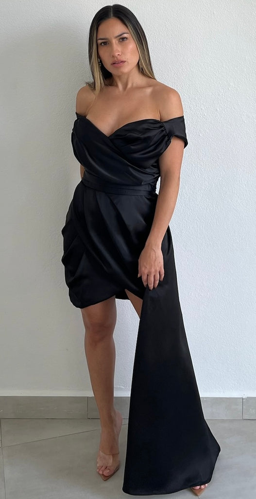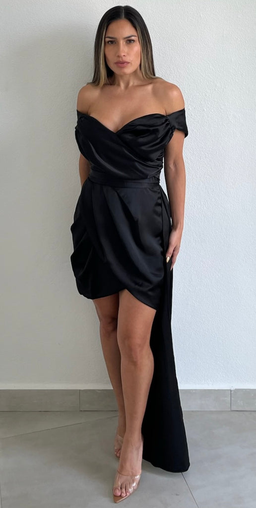 featuring Off the Shoulder Top, draped at the Bust and Fitted at the Waist and Overlapping Skirt in a Satin Black Fabric.