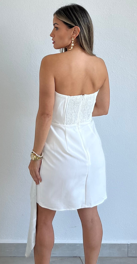 featuring Strapless Corset Top, Mini Skirt with Drape Fabric Detail and Long Fabric Detail at the Side in a White Fabric.