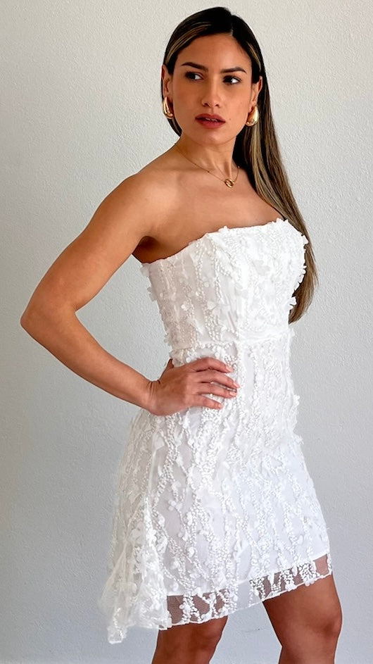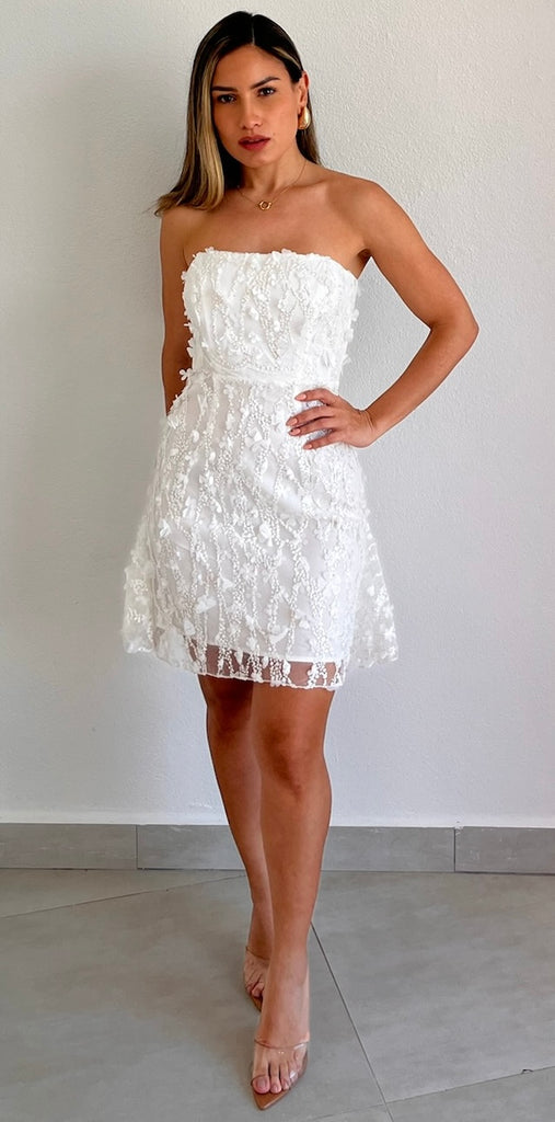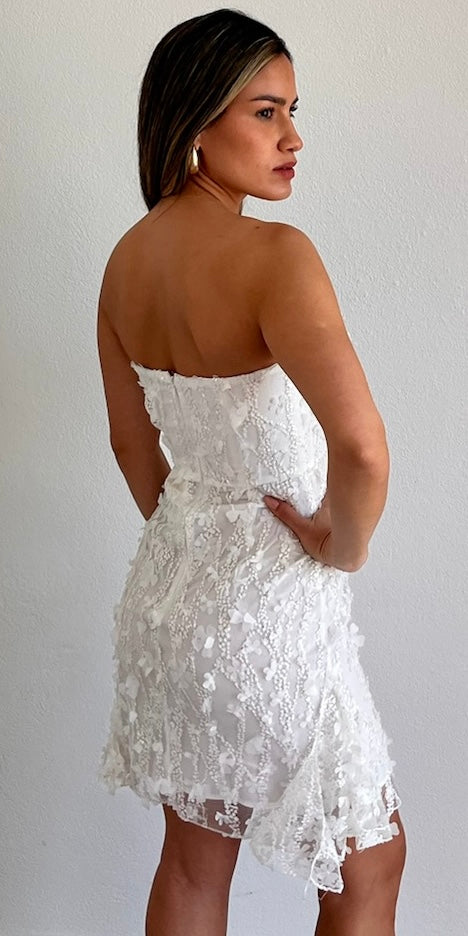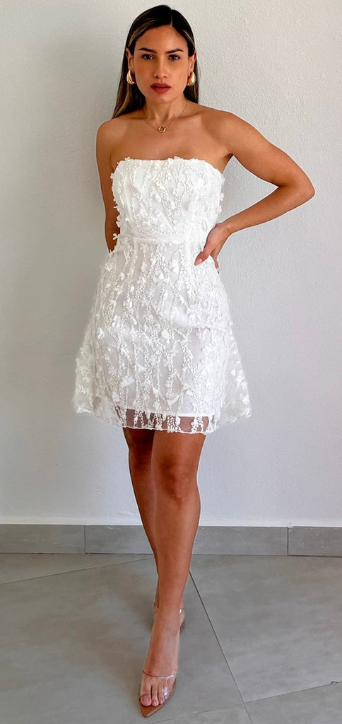 featuring Strapless Top, Fitted at the Waist and Flare Skirt in a Texture Floral Lace White Fabric.