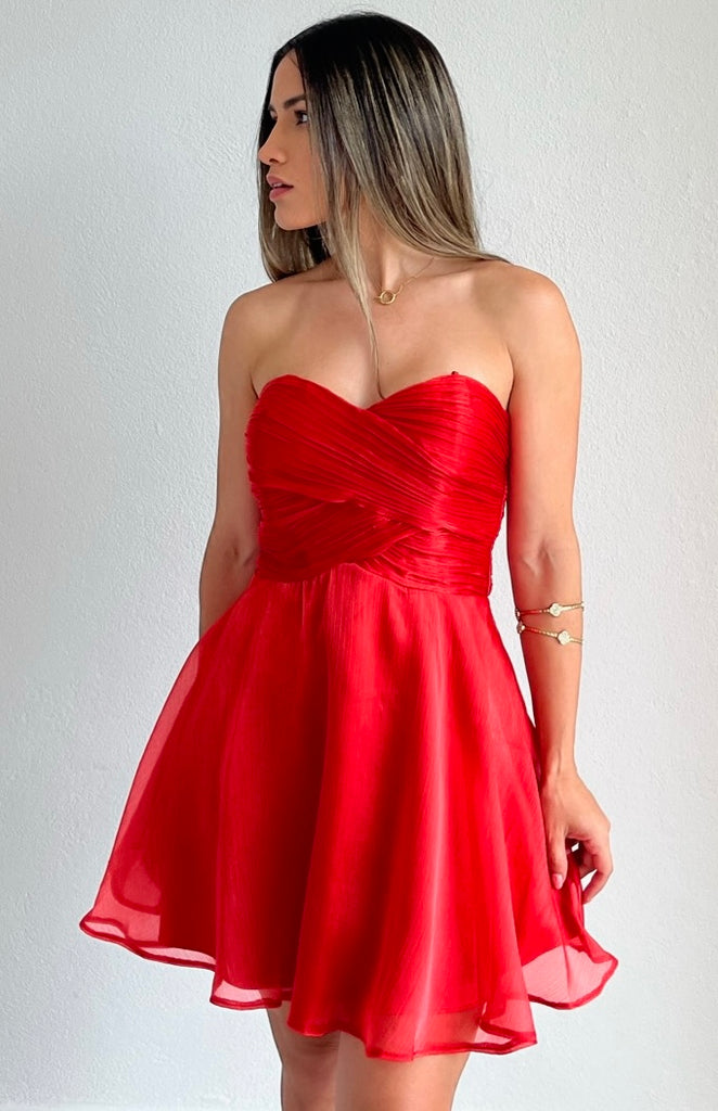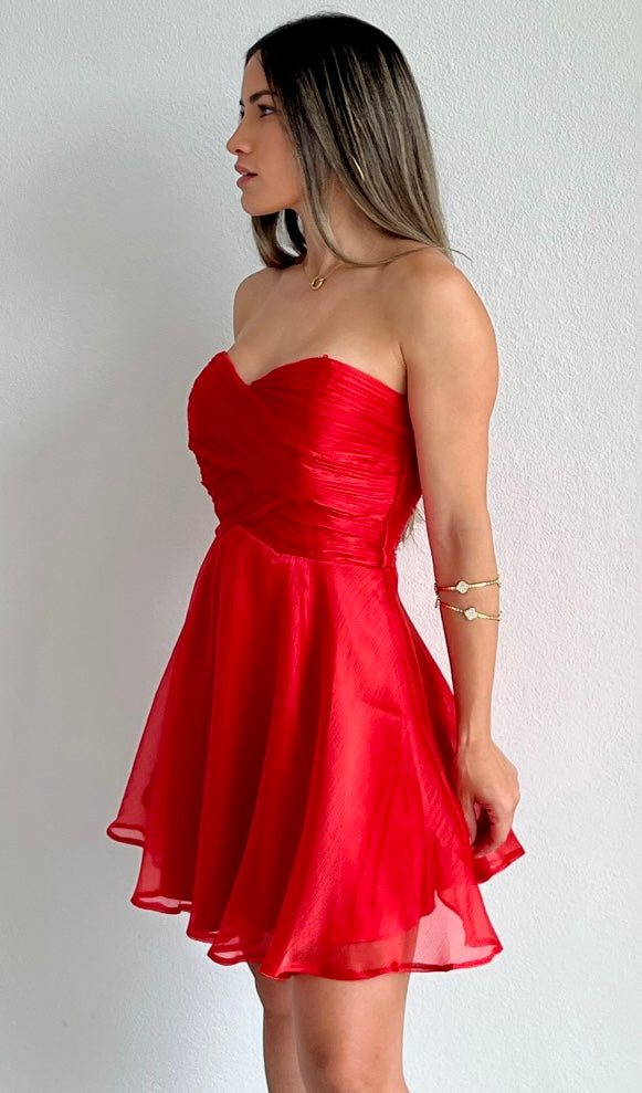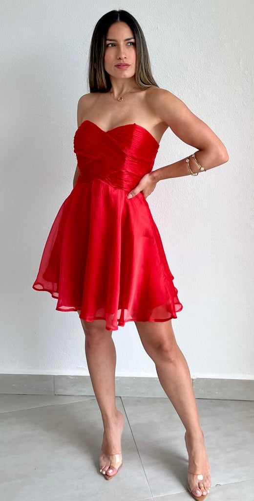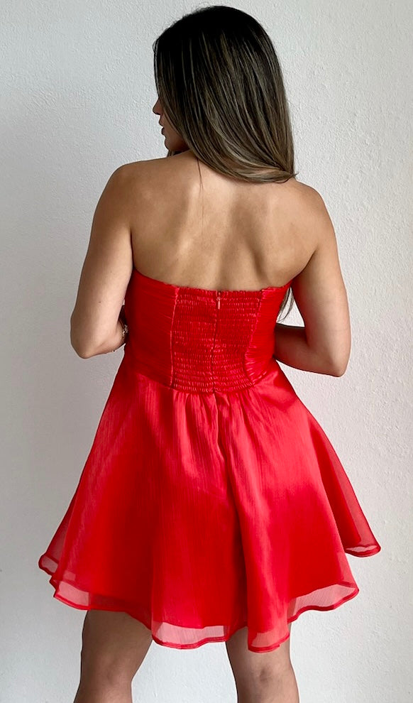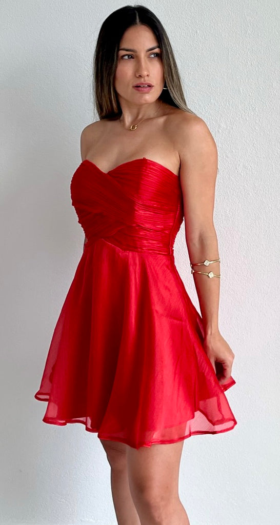 featuring Strapless Draped Top & Flare Skirt in a Silk Orange-Red Fabric.