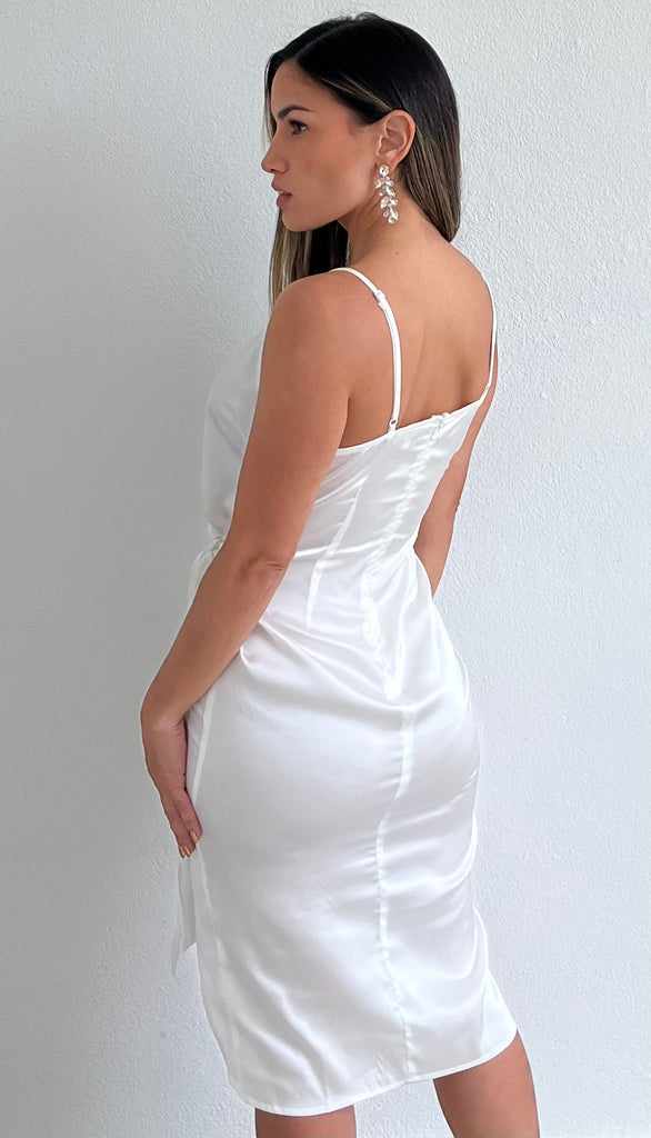 featuring V-Neck Wrap Around White Satin Dress with Adjustable Knot Detail at the Front.