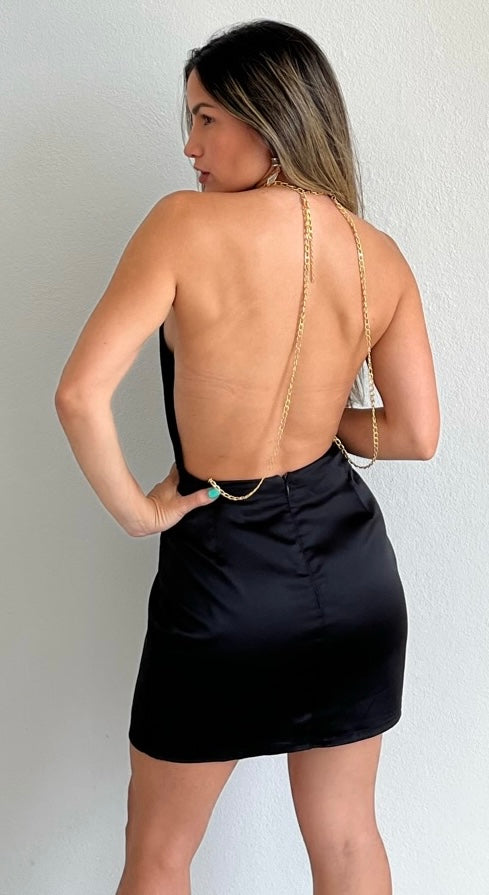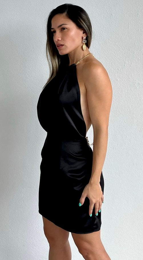 featuring Halter Top with Open Back and Gold Chain Detail at the Back. Simple Skirt in a Soft Black Satin Fabric.