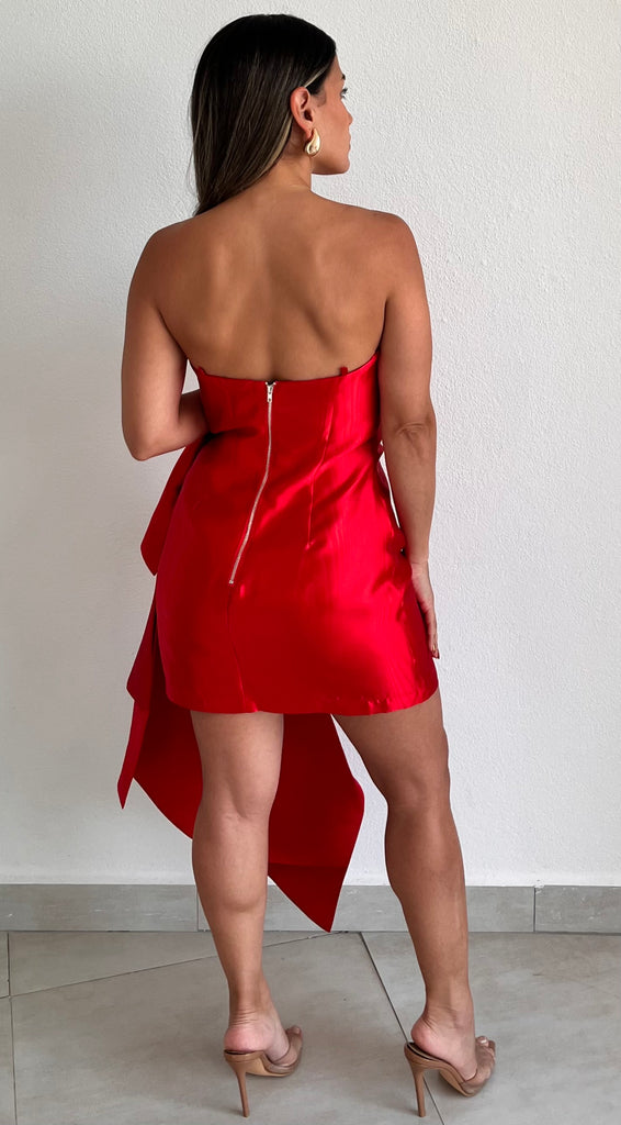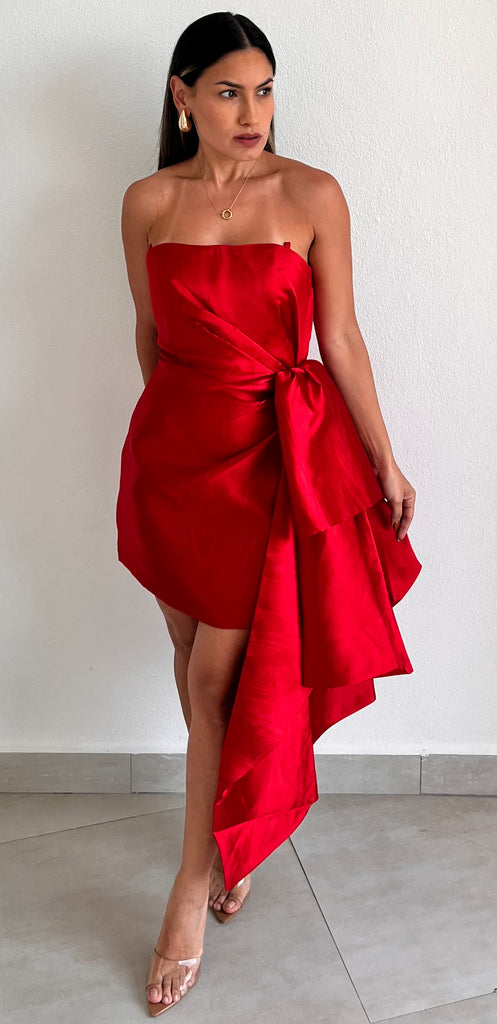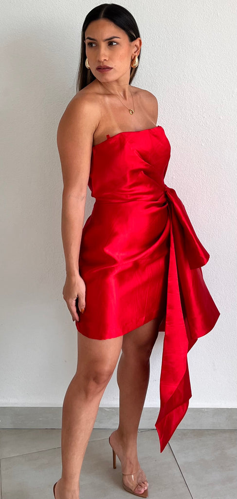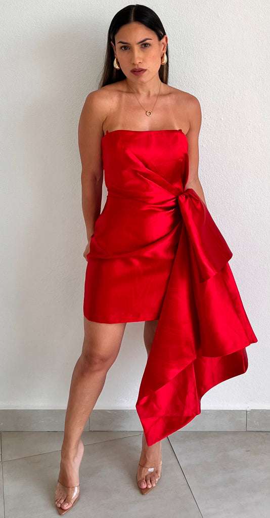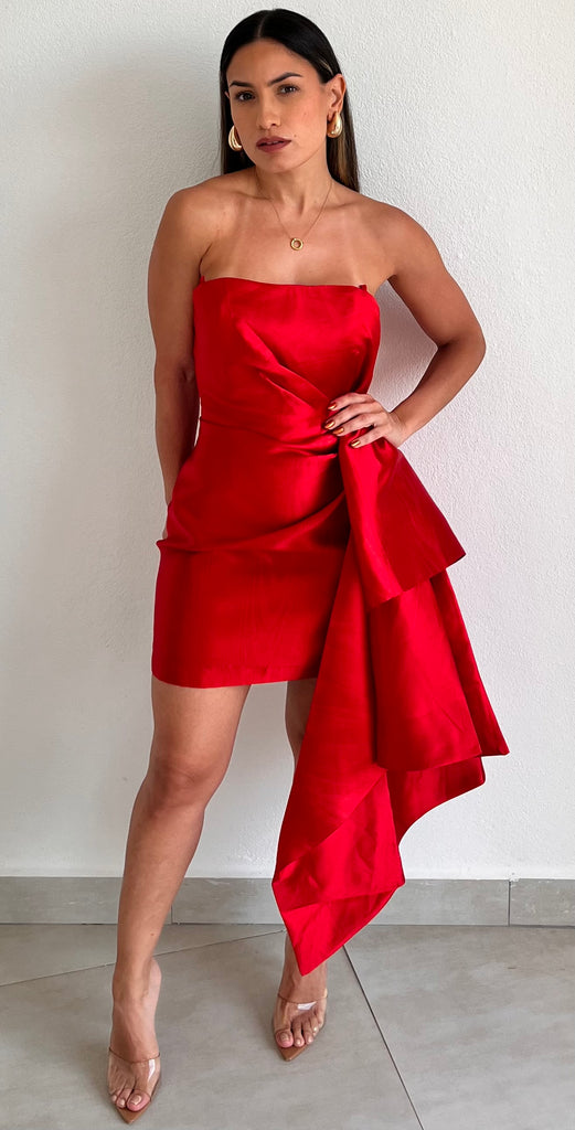 featuring Strapless Top, Fitted at the Waist and Ruffled Detail From the Waist to the Skirt in a Satin Fabric.