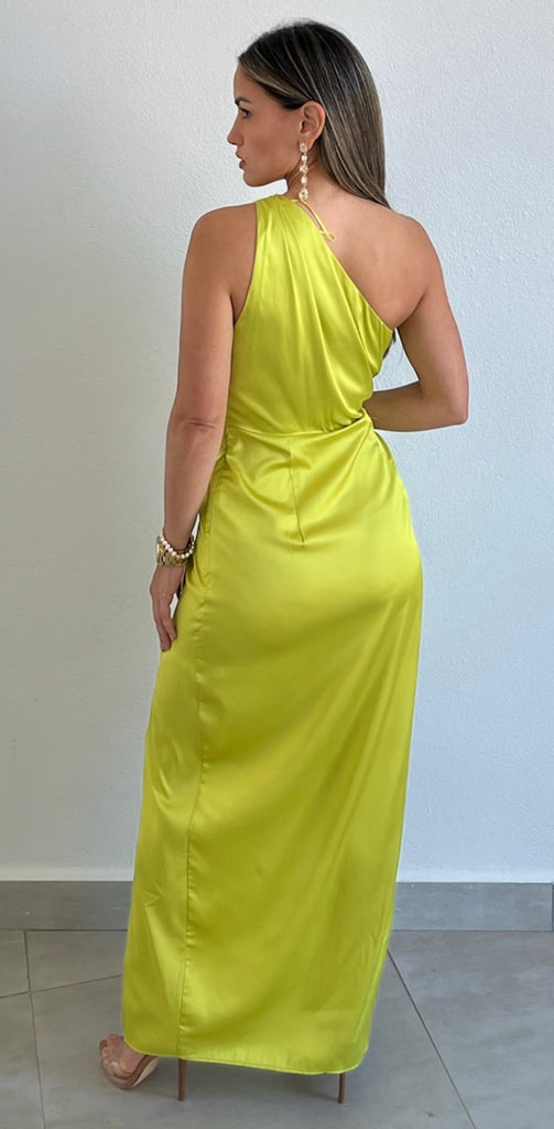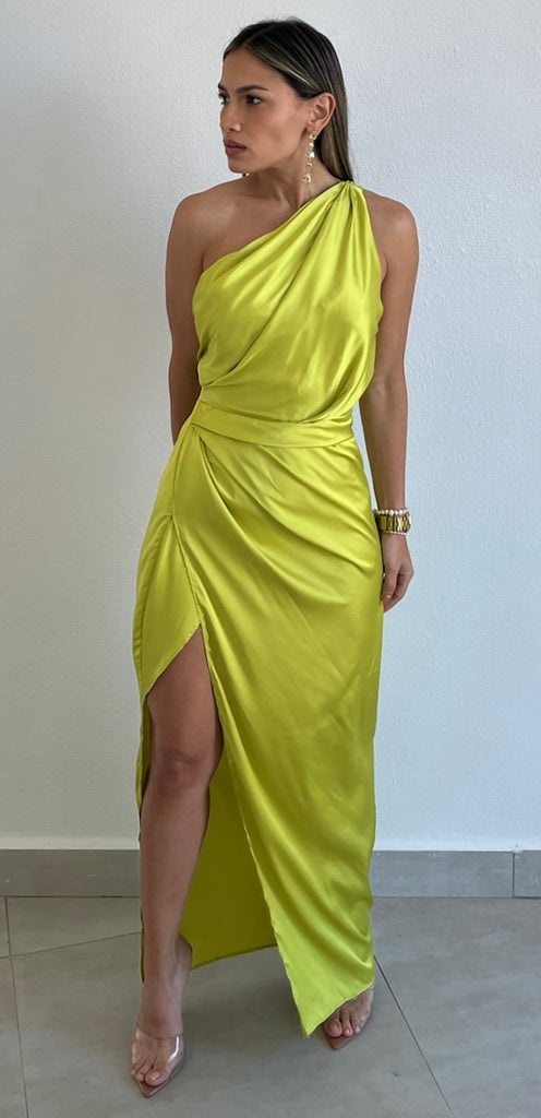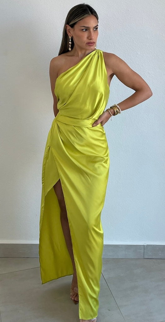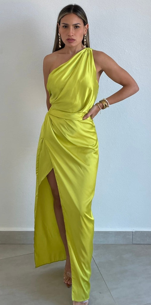featuring One-Shoulder Top, Fitted at the Waist and Open Slit Midi Skirt Dress in a Soft Satin Lime Fabric.
