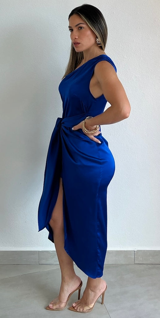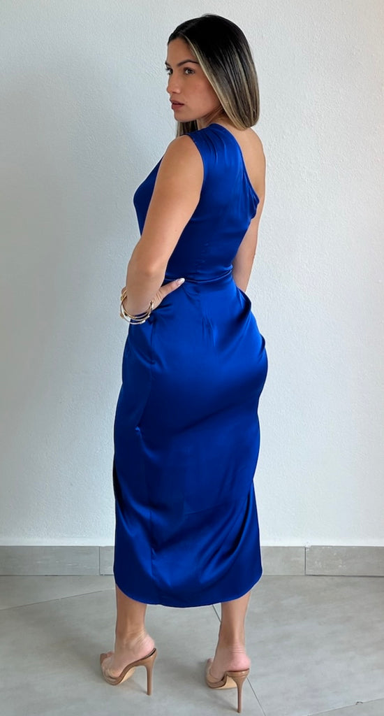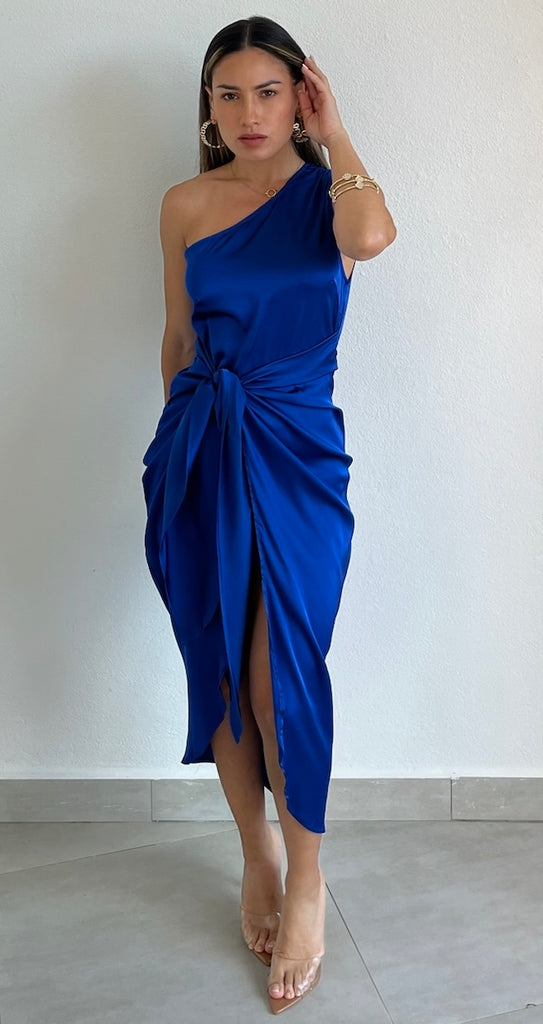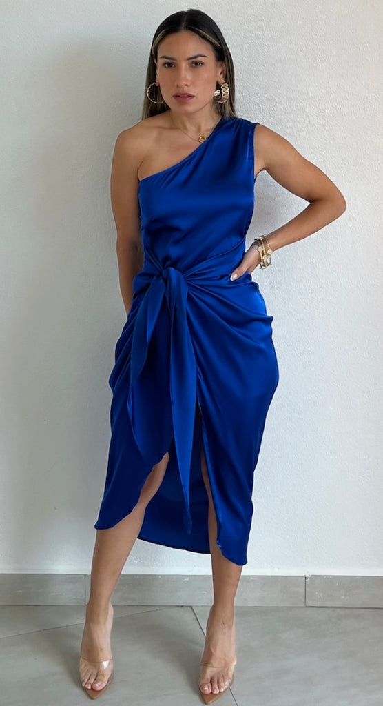 featuring One-Shoulder Dress with Adjustable Knot at the Hips in a Soft Satin Royal Blue Fabric.
