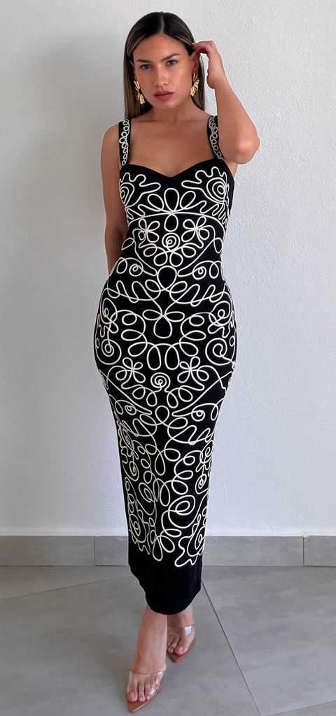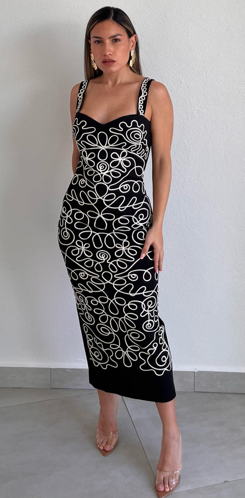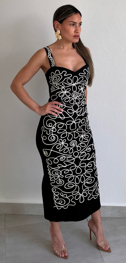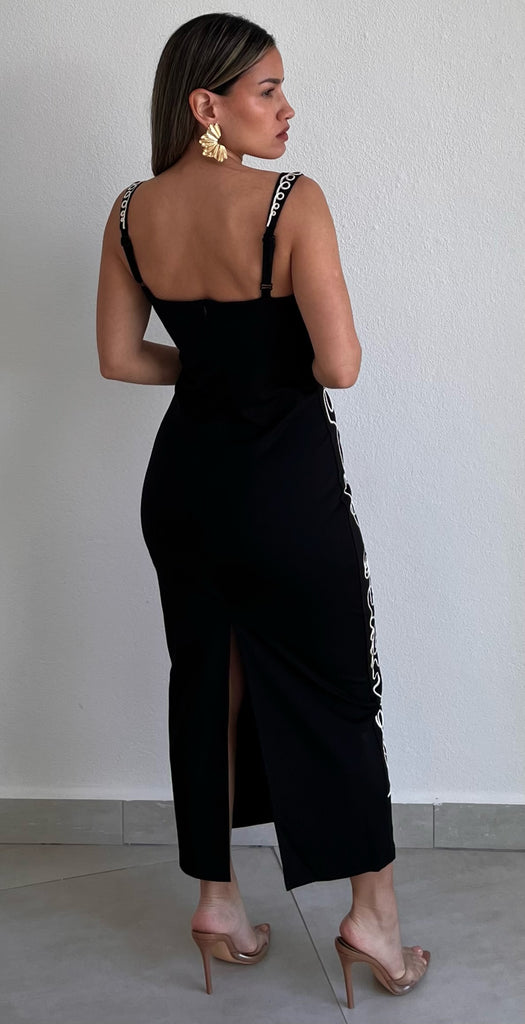 featuring Heart Cut Top with Bold Straps and Fitted Midi Skirt in a Black Fabric with Beige Designed Detail at the Front of the Dress.