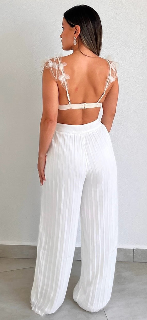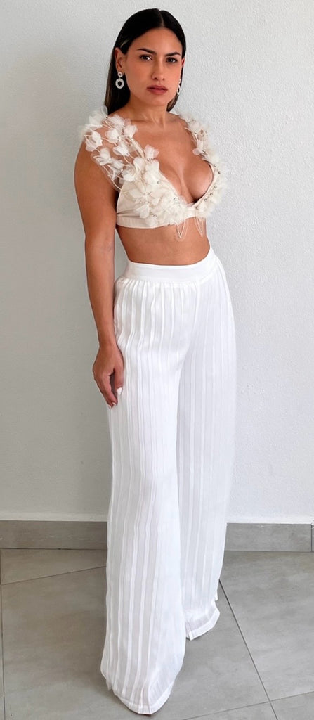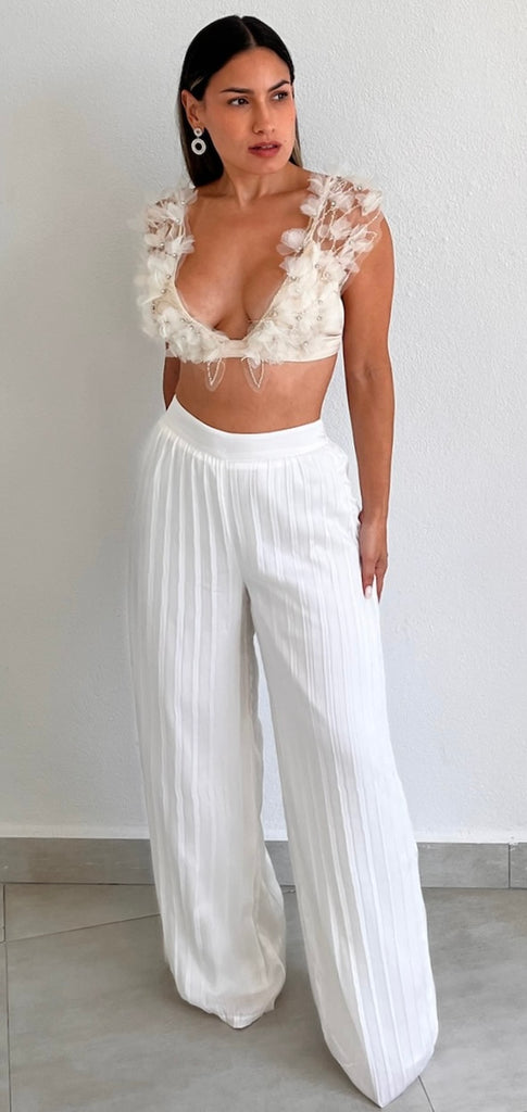 featuring Beige Bralette Top with Chiffon Flowers and Beads Details and White High Waist Flare Pants.