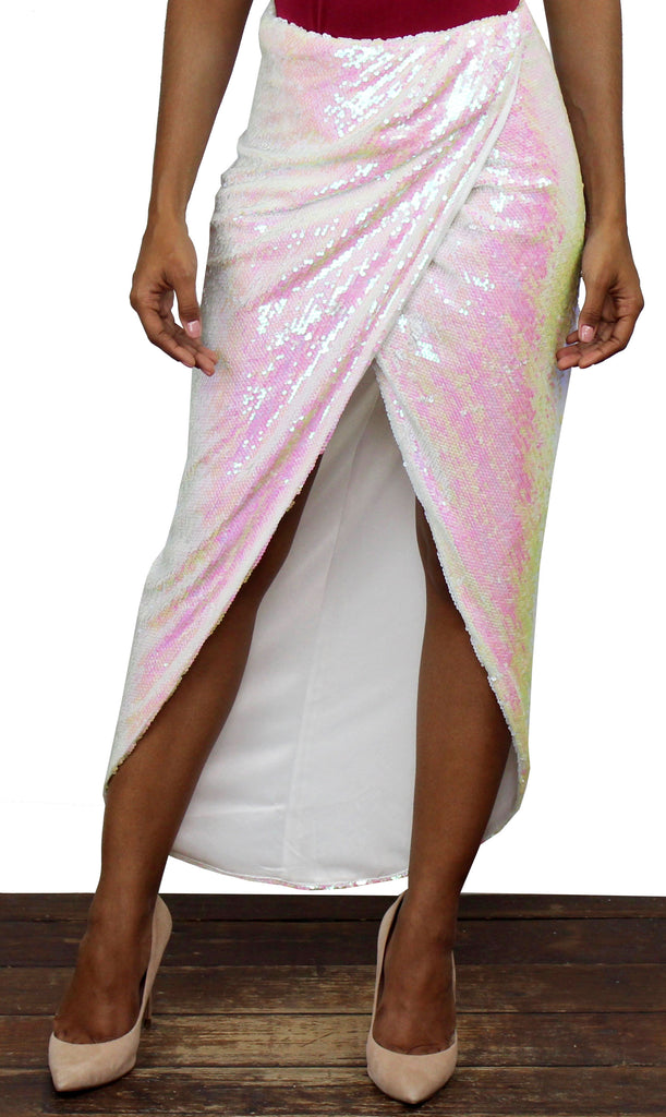 featuring High Waist Draped High Low Skirt in White Litmus Sequins Spandex Fabric.