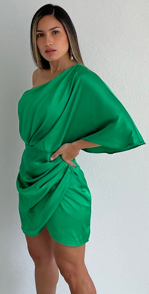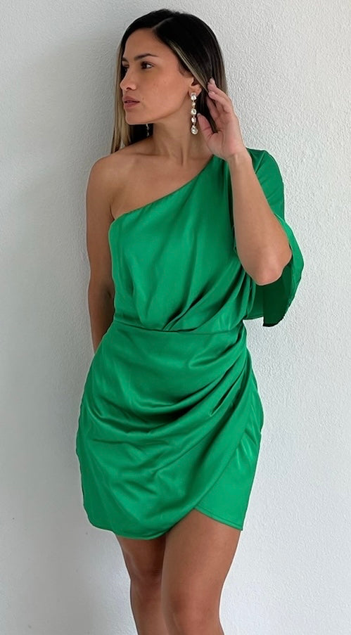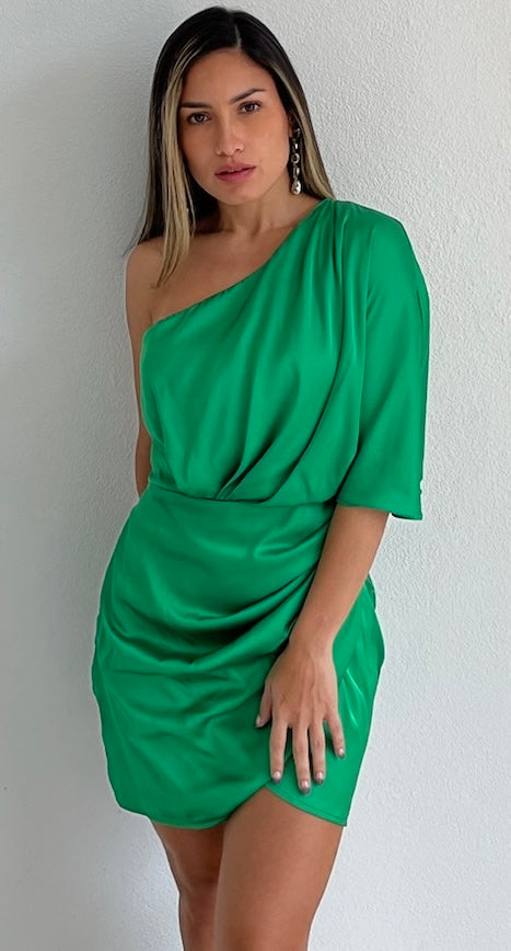 featuring One-Shoulder 3/4 Sleeve Dress with Draped Detail at the Skirt in a Soft Satin Green Fabric.