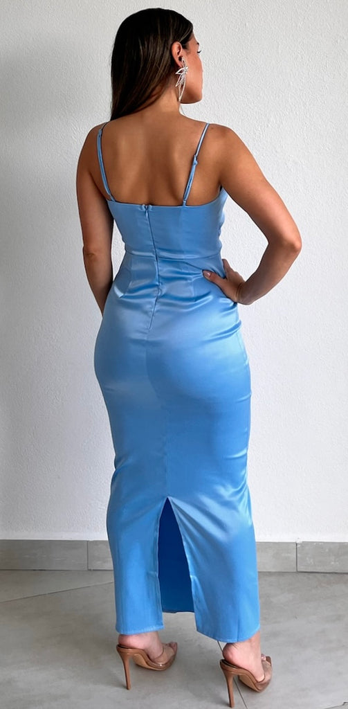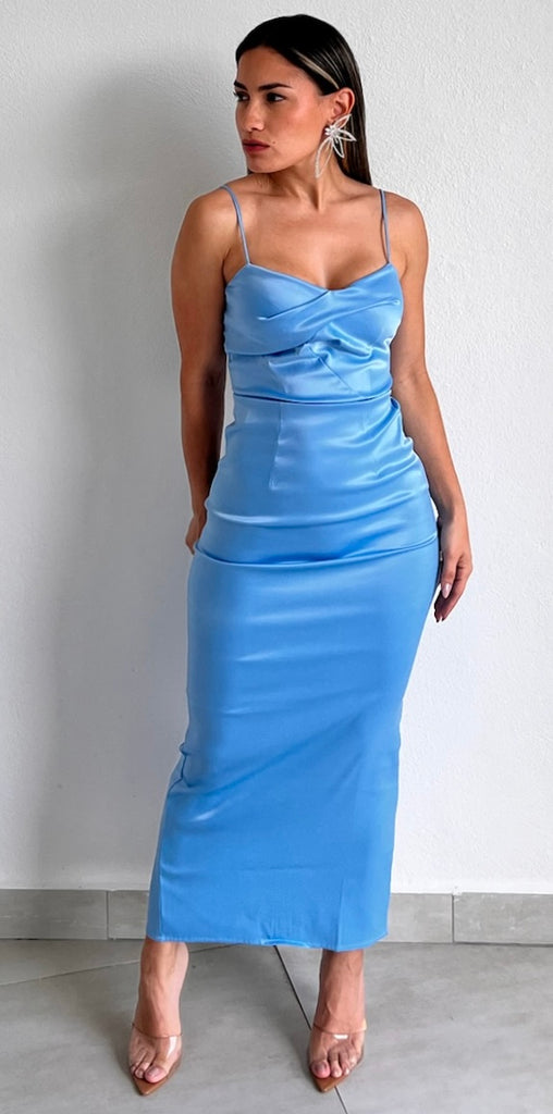 featuring Square Top with Spaghetti Straps, Fitted at the Waist and Midi Fitted Skirt in a Light Blue Satin Fabric.