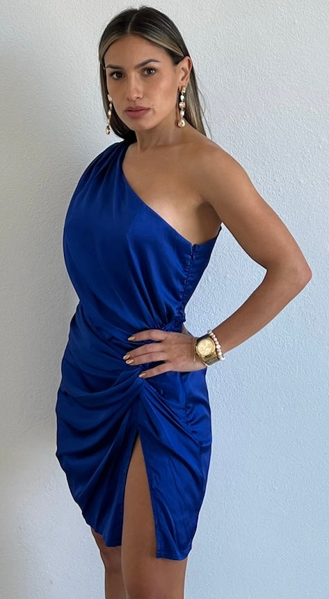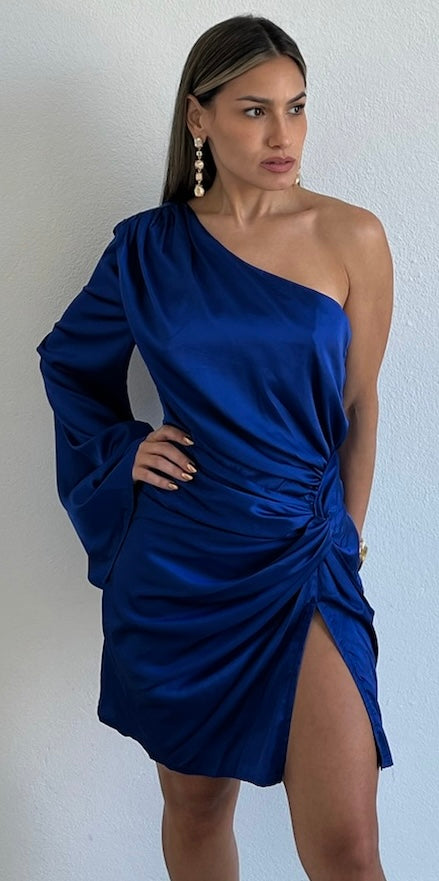 featuring One-Shoulder Long Sleeve Top with Twisted Detail at the Front of the Hip and Small Slit Detail in a Satin Royal Blue Fabric.