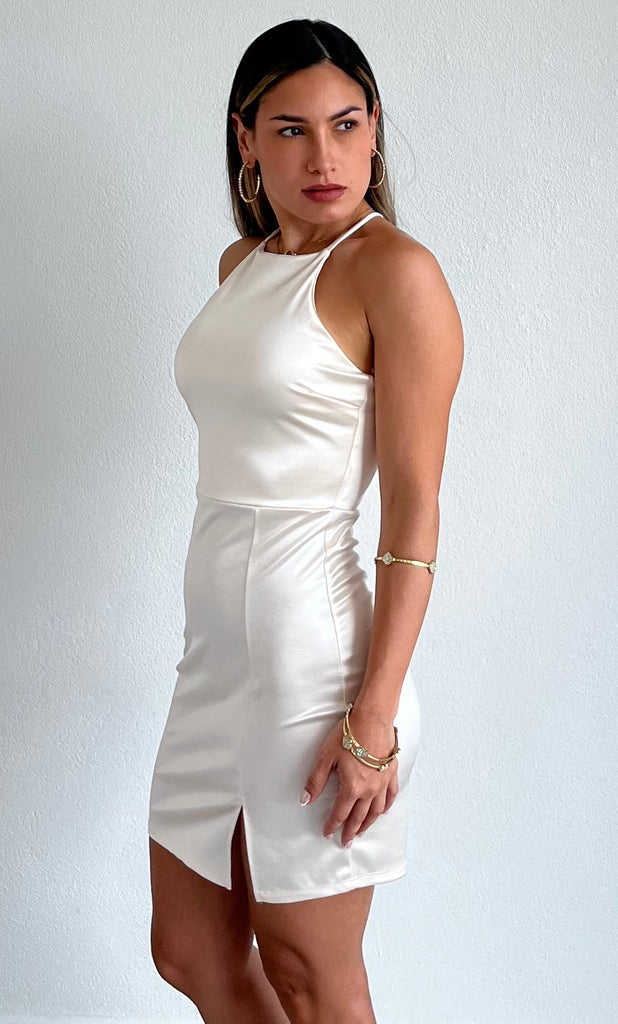 featuring Sleeveless Top, Crossed Back and Fitted Skirt with Little Slit Detail in a Spandex Soft Satin Cream Fabric.