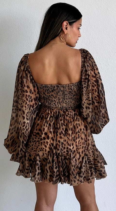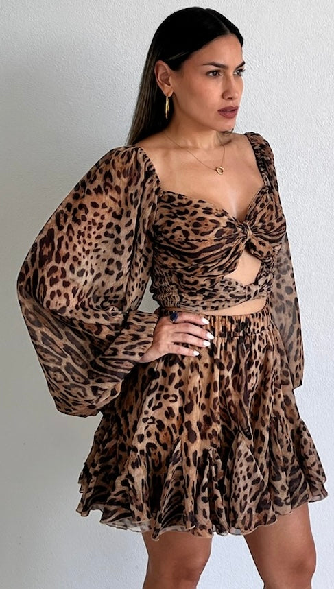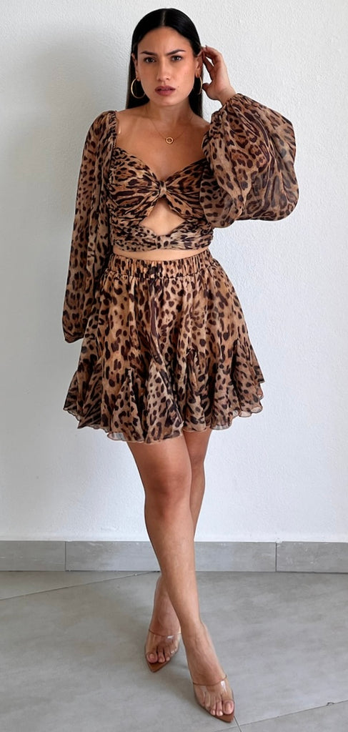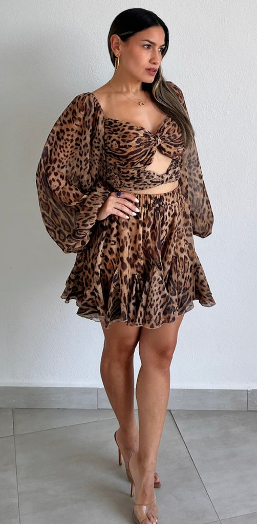 featuring Long Sleeves Top with Cut-Out Detail at the Bust, Hight Waist Flare Skorts Denim Fabric in a Animal Print Chiffon Lightweight Fabric.