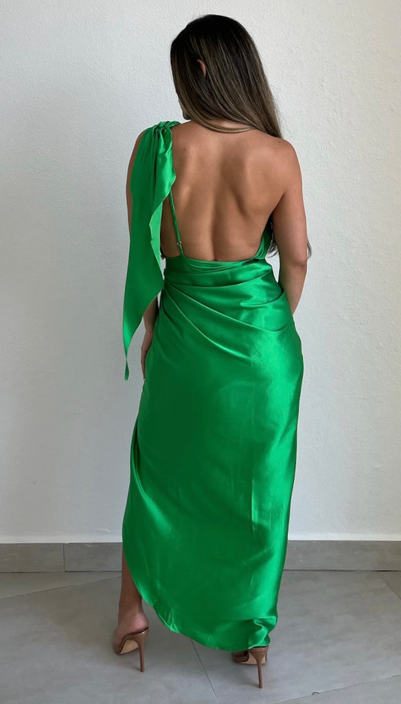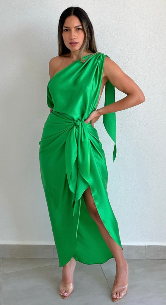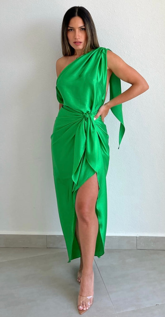 featuring One-Shoulder Dress with Adjustable Knot at the Hips in a Soft Satin Green Fabric.