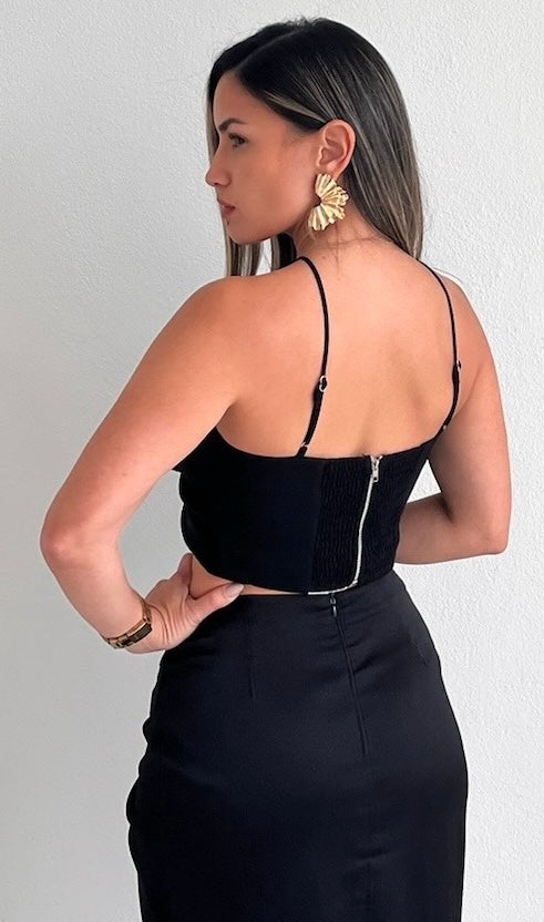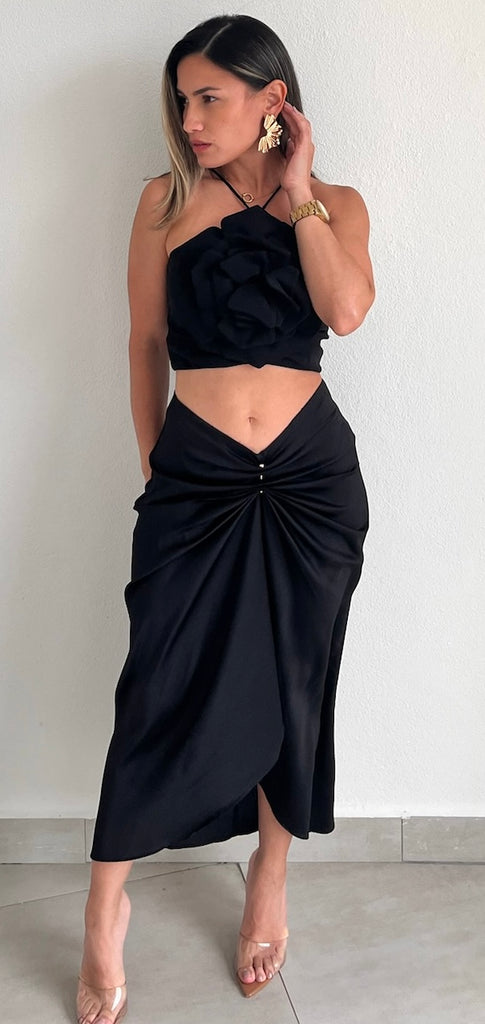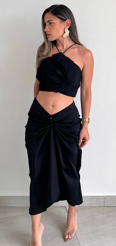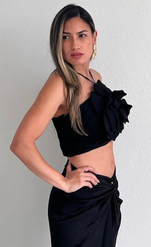featuring Halter Crop Top with Flower Detail at the Front in a Black Fabric.