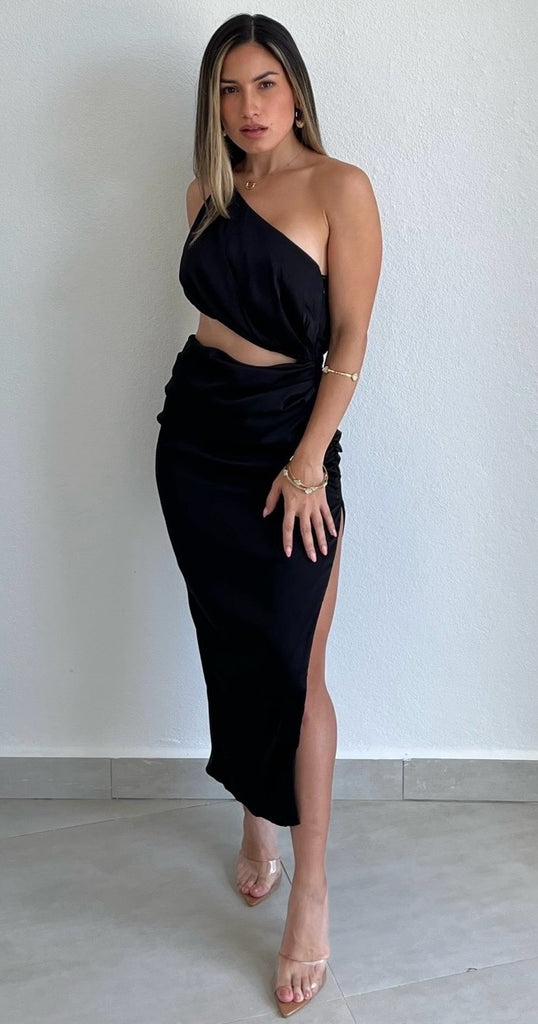 featuring One-Shoulder Top with Cut-Off Detail at the Waist and Midi Skirt with Side Open Slit in a Soft Black Satin Fabric.