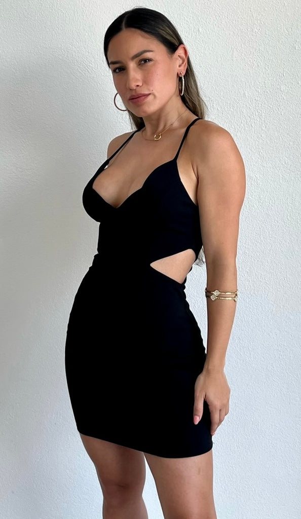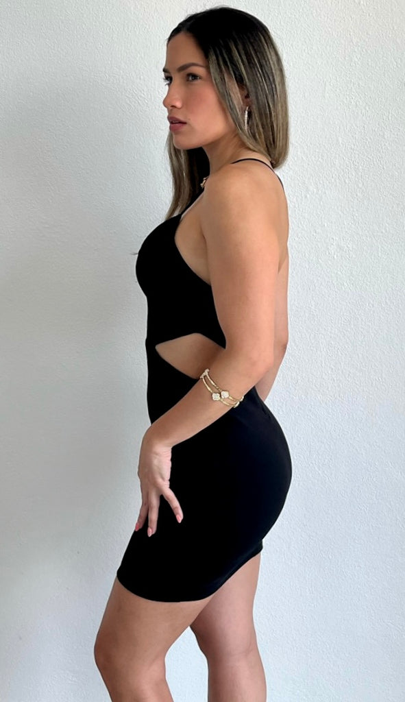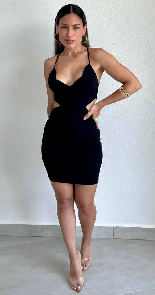 featuring V-Neck Top with Crossed Back and Cut Off Detail at the Waist in a Soft Black Spandex Fabric.