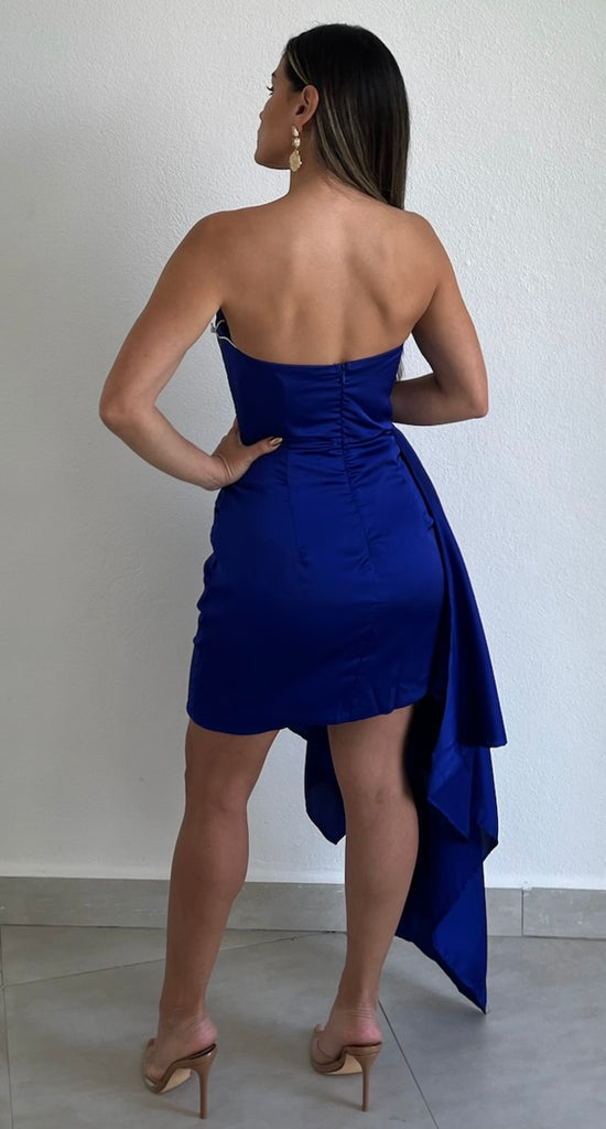 featuring Strapless Top, Mini Skirt with Drape Fabric Detail and Long Fabric Detail at the Side in a Satin Royal Blue Fabric.