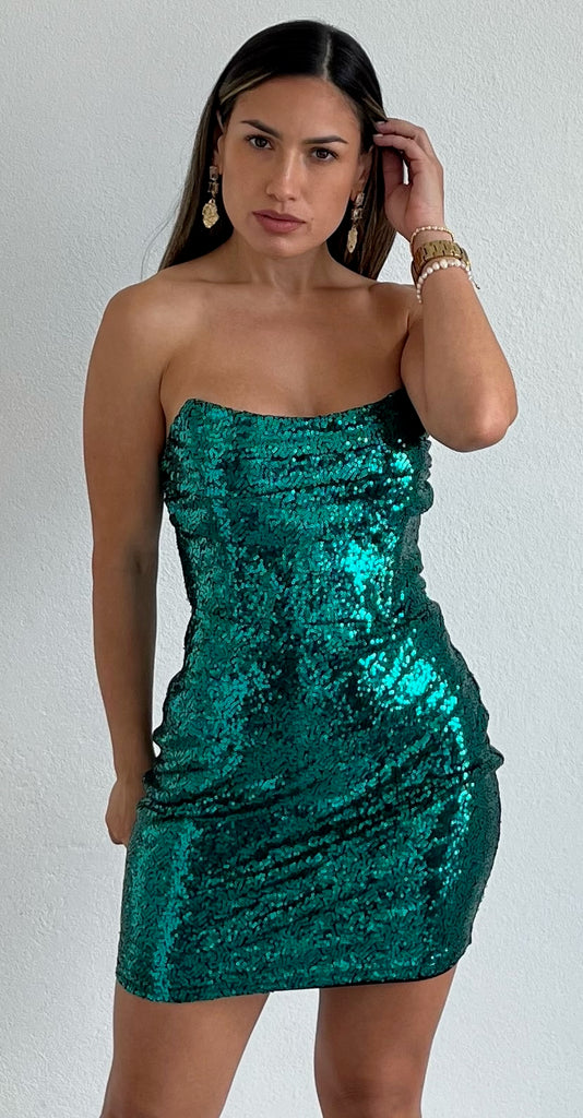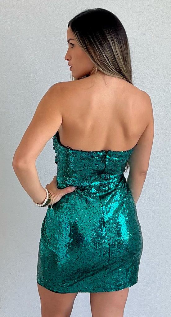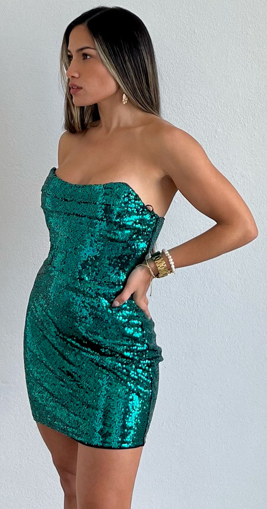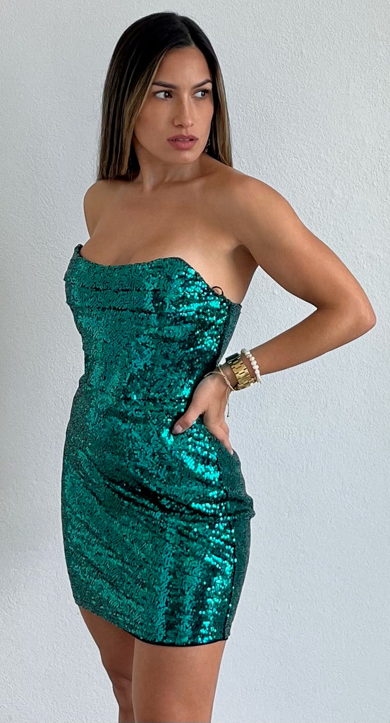 featuring Strapless Corset Top with Fitted Mini Skirt in a Emerald Sequins Spandex Fabric.