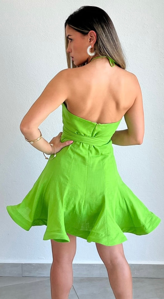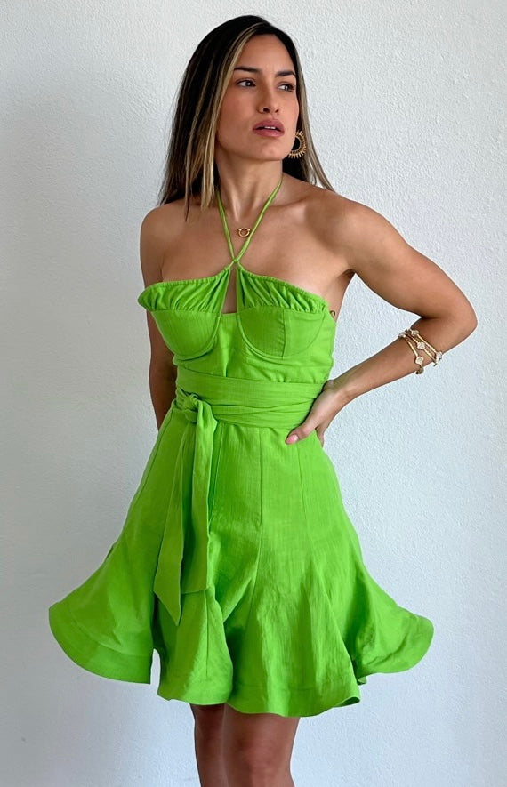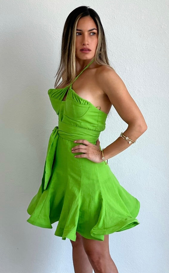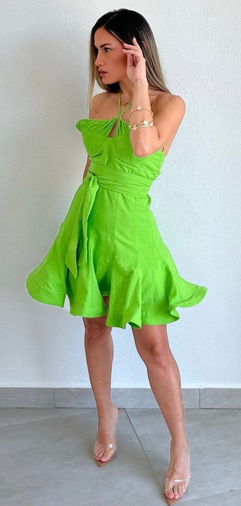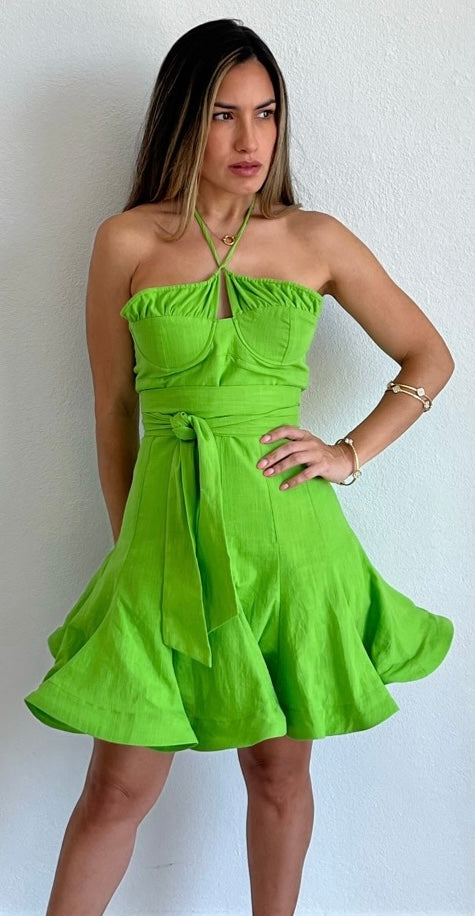 featuring Halter Top with Bust Wire and Ruffled Detail, Fitted at the Waist and Flare Skirt in a Lime Cotton Fabric.