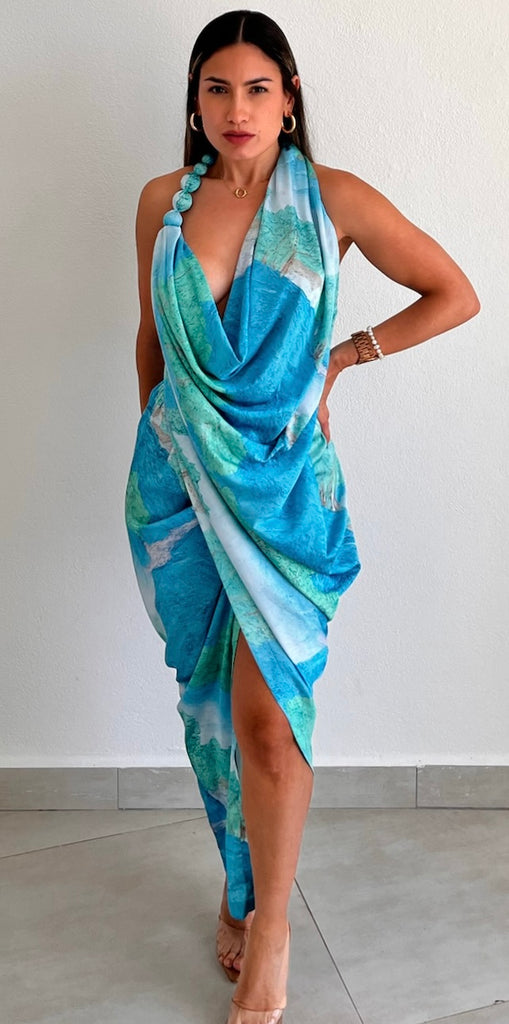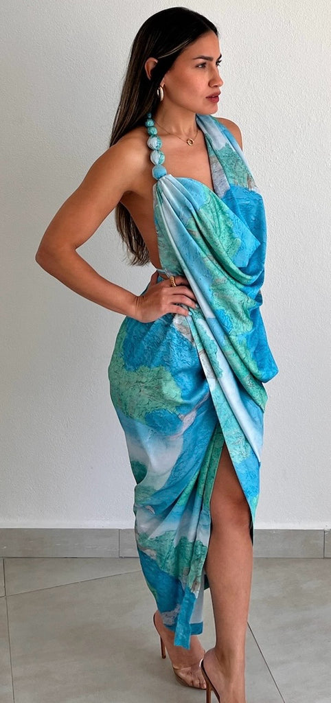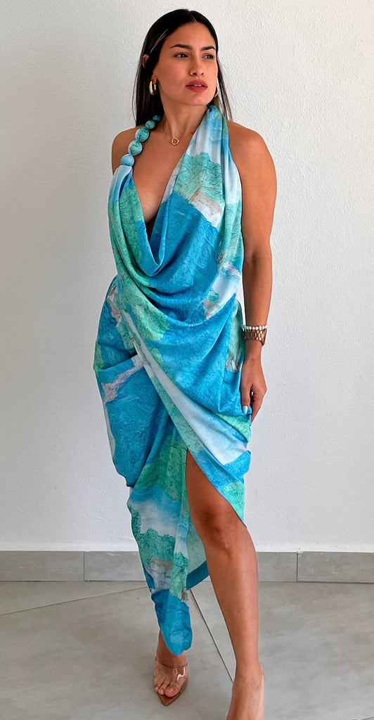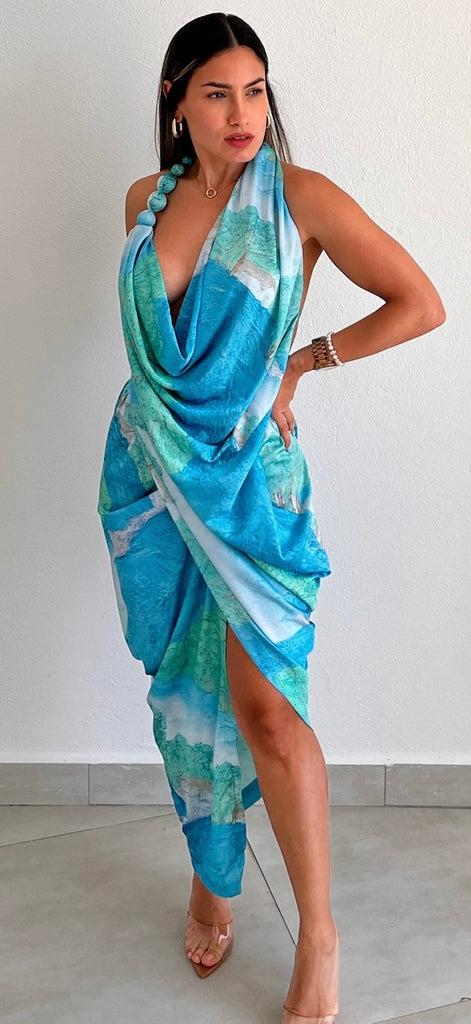 featuring Halter- Cowl Top with On-Side Balls Necklace Detail, Adjustable at the Waist and Asymmetrical Midi Skirt in a Soft Print Satin Fabric.
