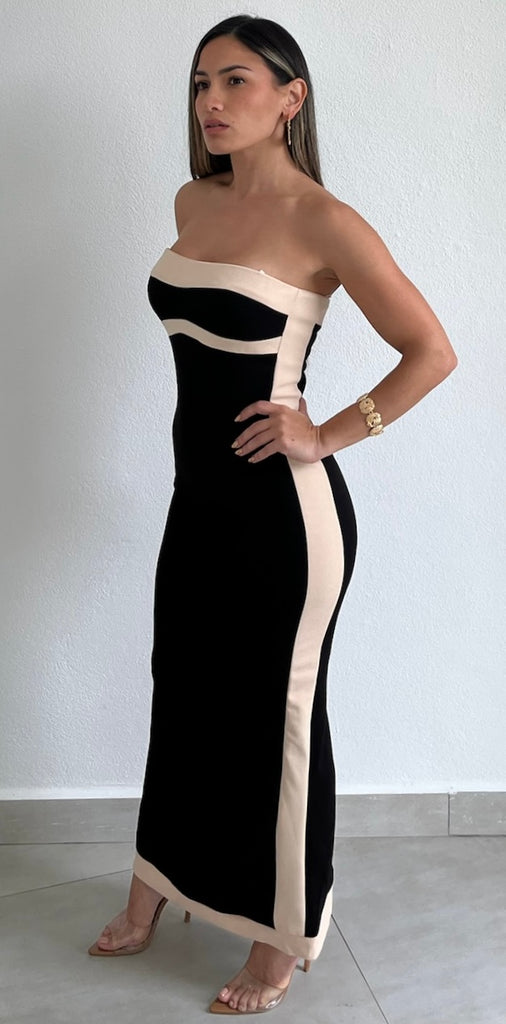 featuring Strapless Top, Fitted Waist and Hips with Nude Lines Detail at the Top & Sides in a Spandex Fabric. Open Slit at the Back