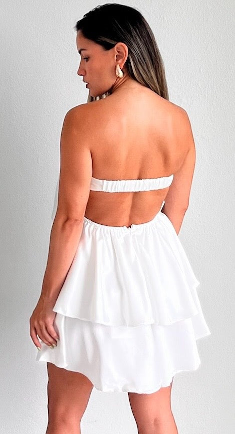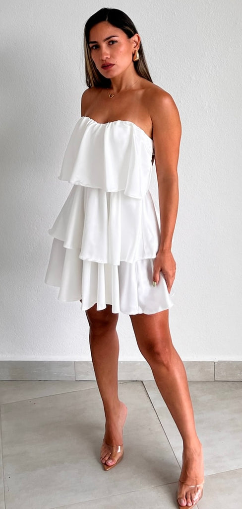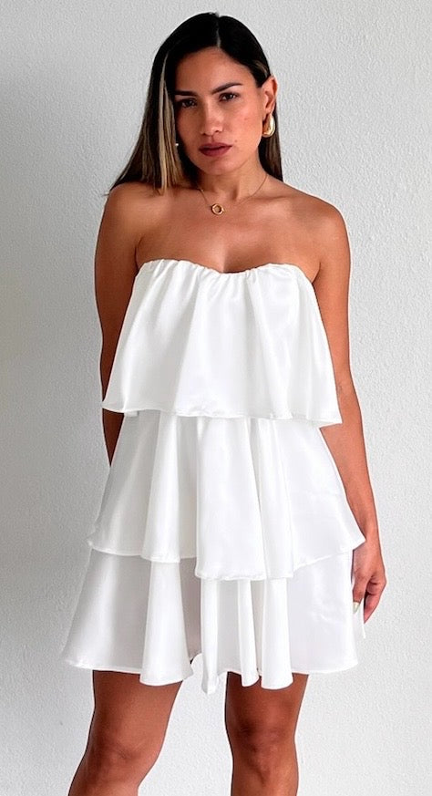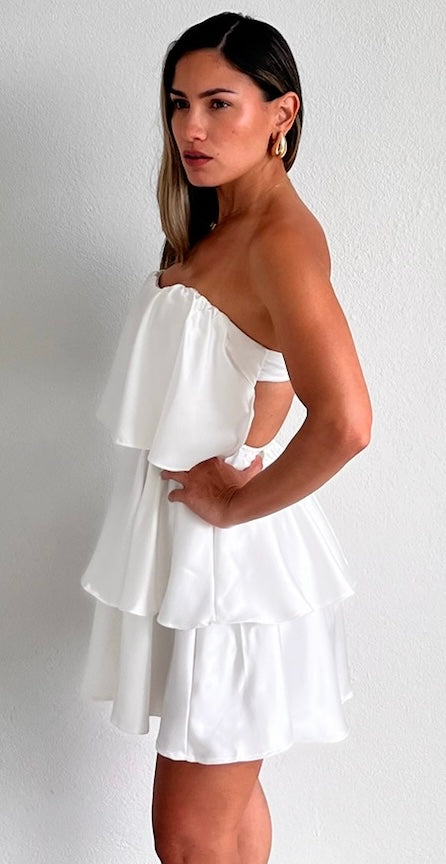 featuring Strapless Top, Open at the Back with Layers of Ruffled in White Satin Fabric.