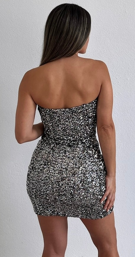 Showstopper Silver Strapless Dress