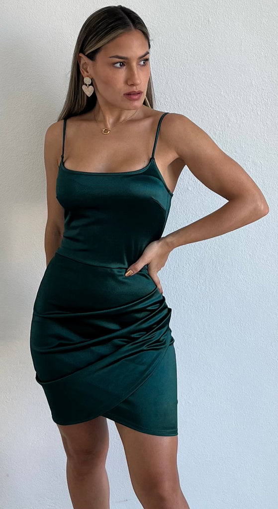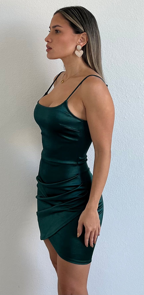 featuring Square Neckline with Spaghetti Straps and Fitted Skirt in a Spandex Hunter Green Satin Fabric.