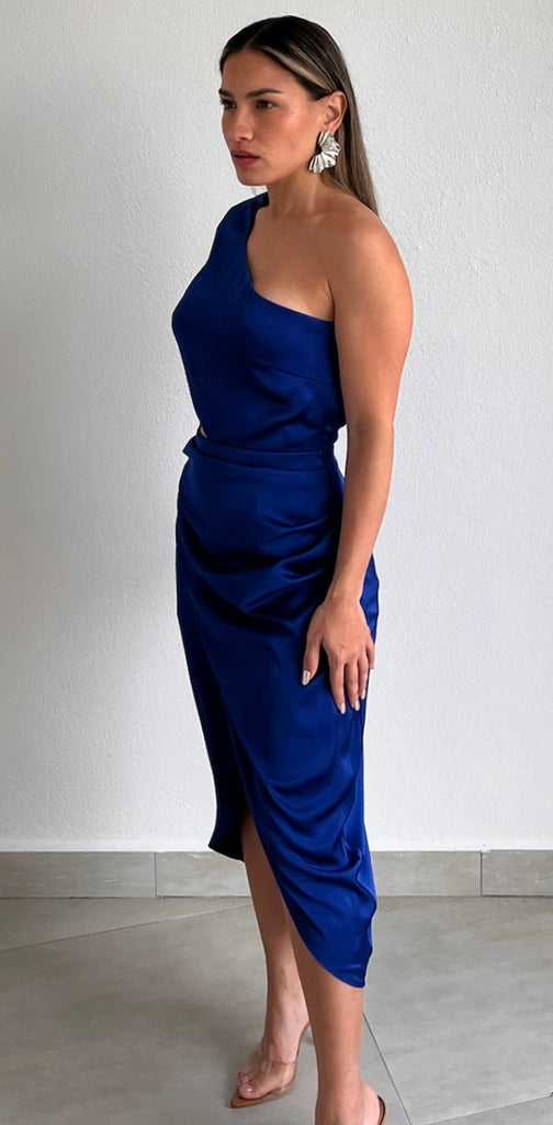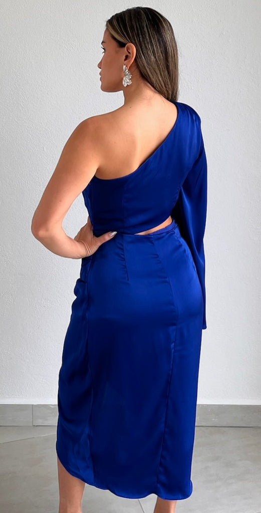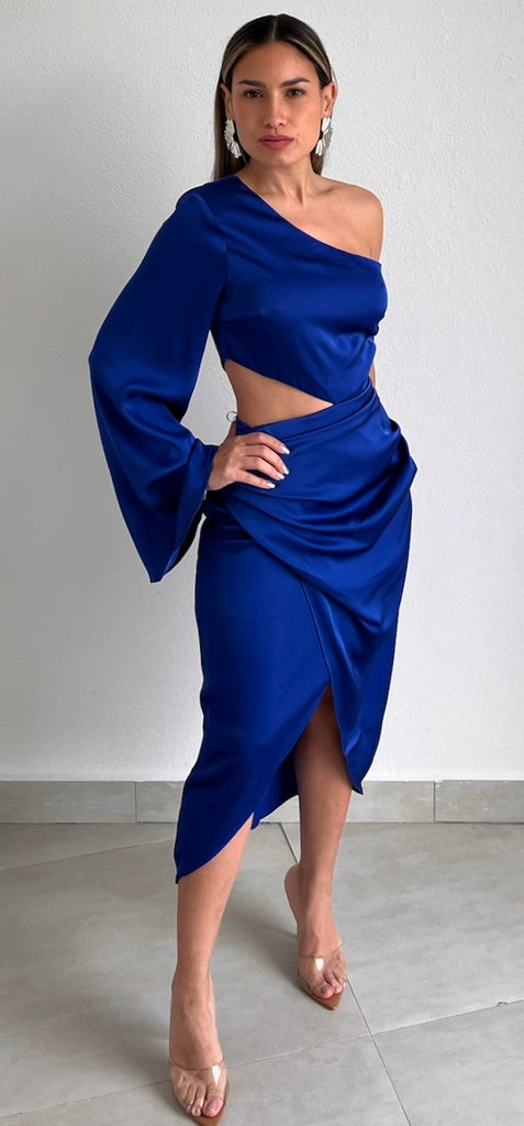 featuring One-Shoulder Long Sleeve Top with Cut-Out Detail at the Waist and High Low Midi Skirt in a Satin Royal Blue Fabric.