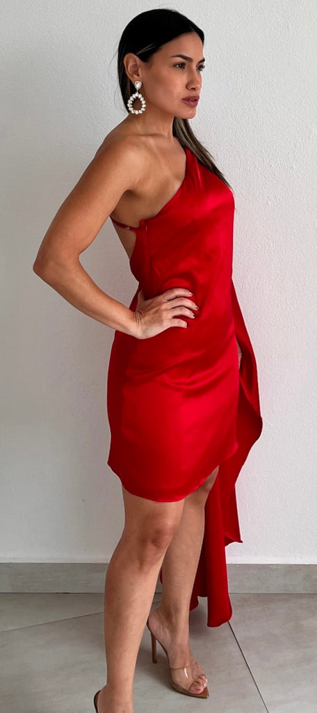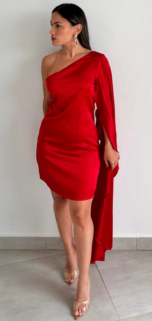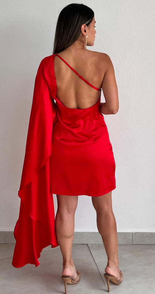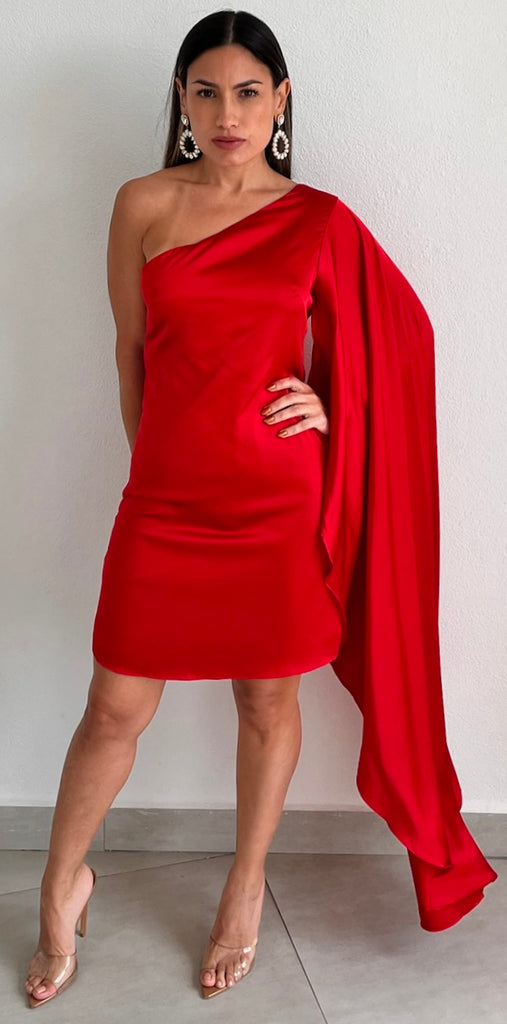 featuring One-Shoulder Long Cape Top with Adjustable Spaghetti & Mini Skirt in a Red Satin Fabric.