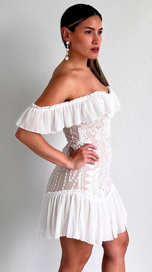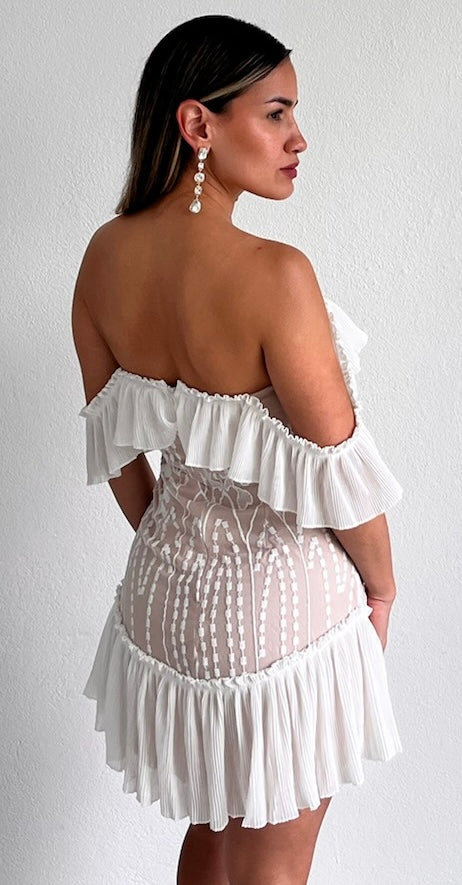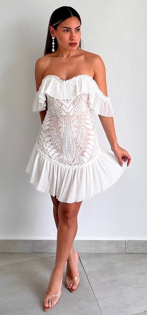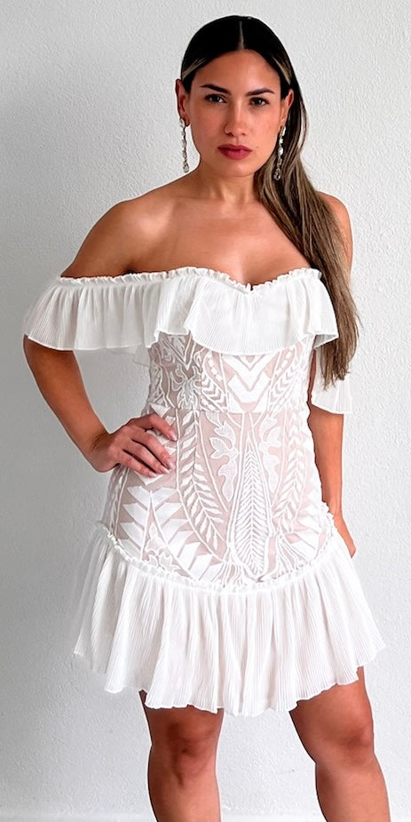 featuring White Ruffled Top (Wear it Off-The-Shoulder or with Short Sleeves) Fitted Lace Dress with Nude Lining and White Ruffled at the Bottom.
