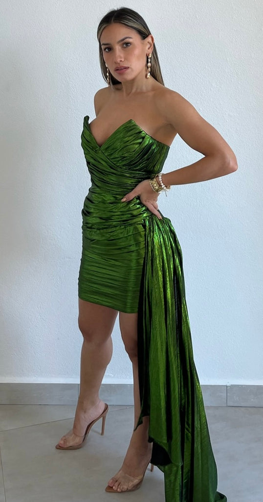 featuring Strapless V-Neck Top, Mini Skirt with Long Fabric Detail at the Side in a Draped Metallic Fabric.