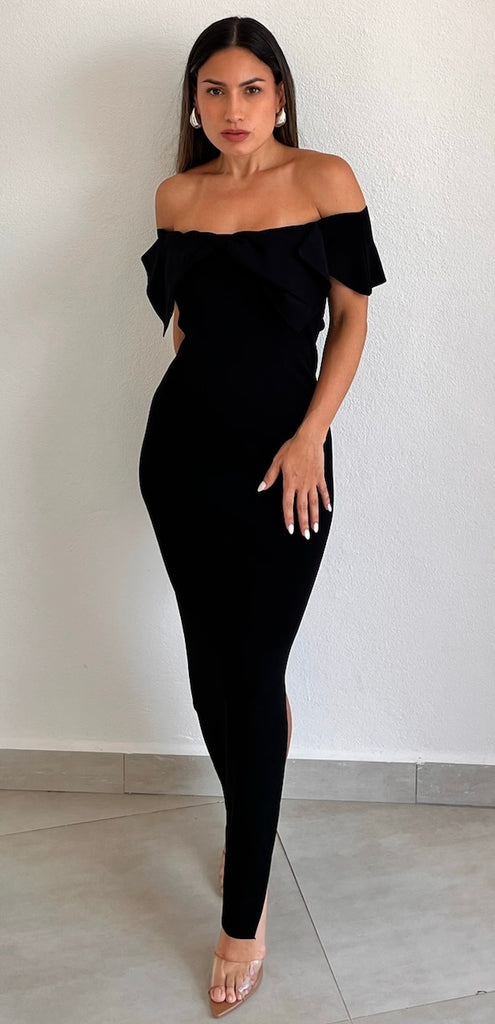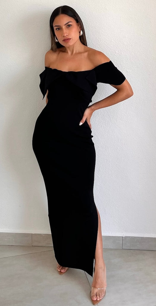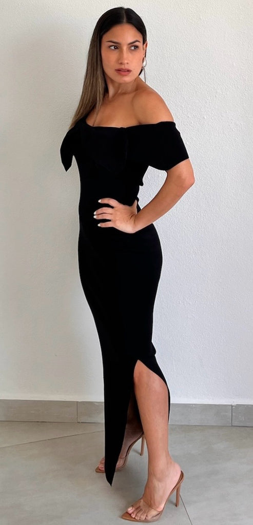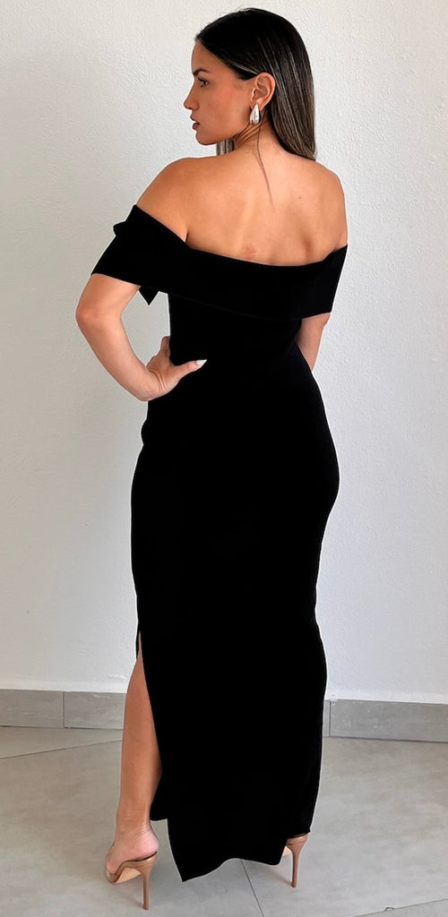 Fitted at the Bust, Waist and Hips in a Black Knit Spandex Fabric. Open Slit at the Side