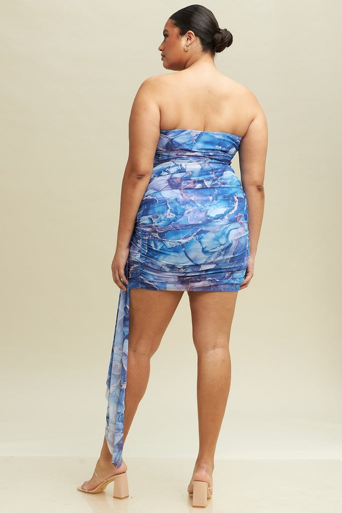 featuring Strapless Top, Mini Skirt with Drape Fabric Detail and Long Fabric Detail at the Side in a Blue Print Mesh Fabric.