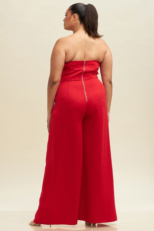 featuring V-Neck Strapless White Jumpsuit with Cutoff at the Waist and Open at the Legs