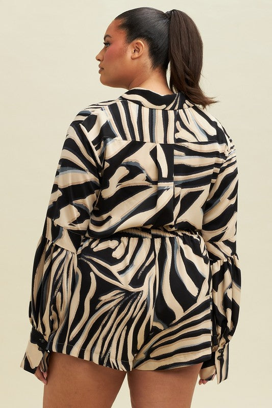 featuring Long Sleeves Buttons Front Romper with Pockets a Satin Zebra Print Fabric.