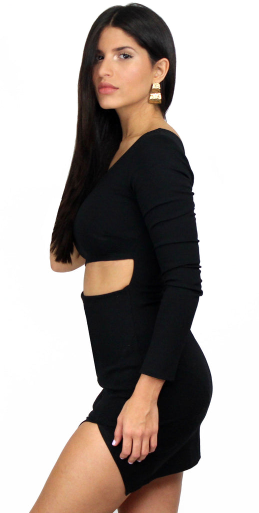 featuring One-Shoulder Long Sleeve Top with Cutout Detail at the Waist, Fitted Skirt with Short Slit in a Soft Spandex Black Fabric