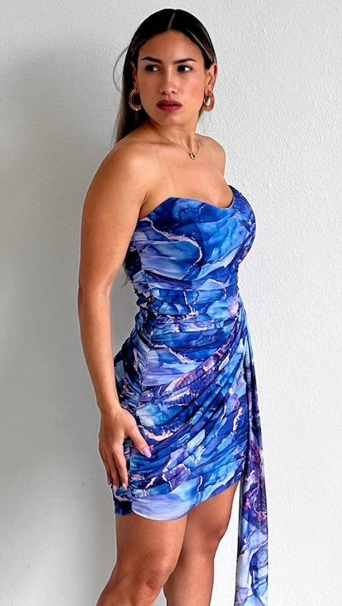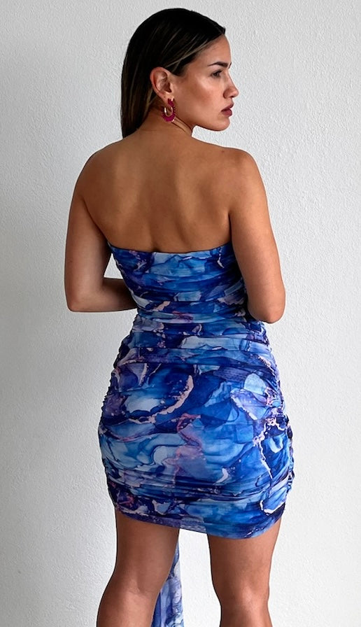 featuring Strapless Top, Mini Skirt with Drape Fabric Detail and Long Fabric Detail at the Side in a Blue Print Mesh Fabric.