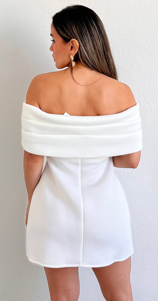 featuring Bold Off-Shoulder Top, Fitted at the Waist and Flare Short Skirt in a White Fabric.