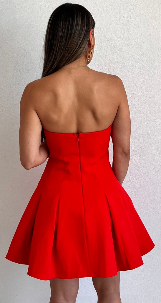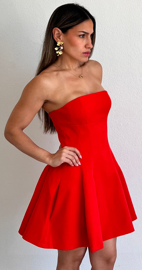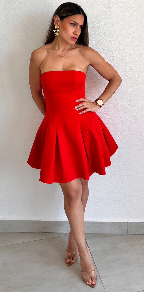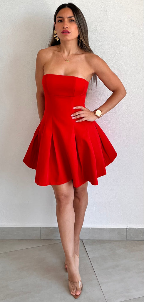 featuring Strapless Top, Fitted at the Waist and Flare Skirt in a Red Fabric.