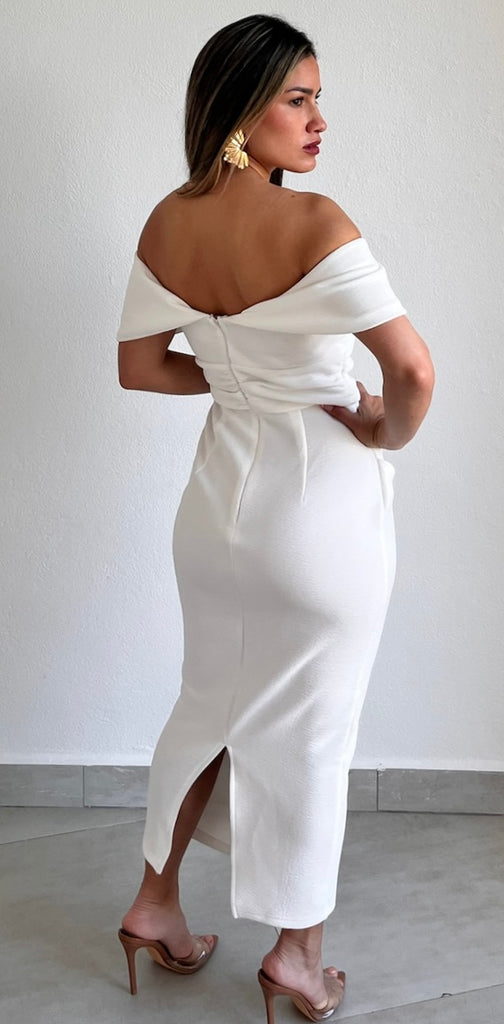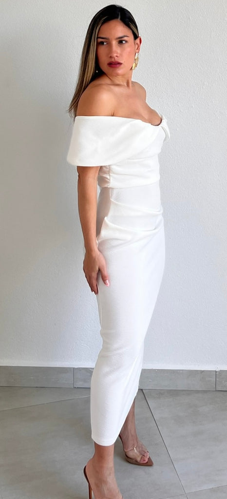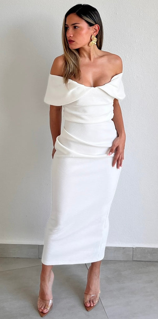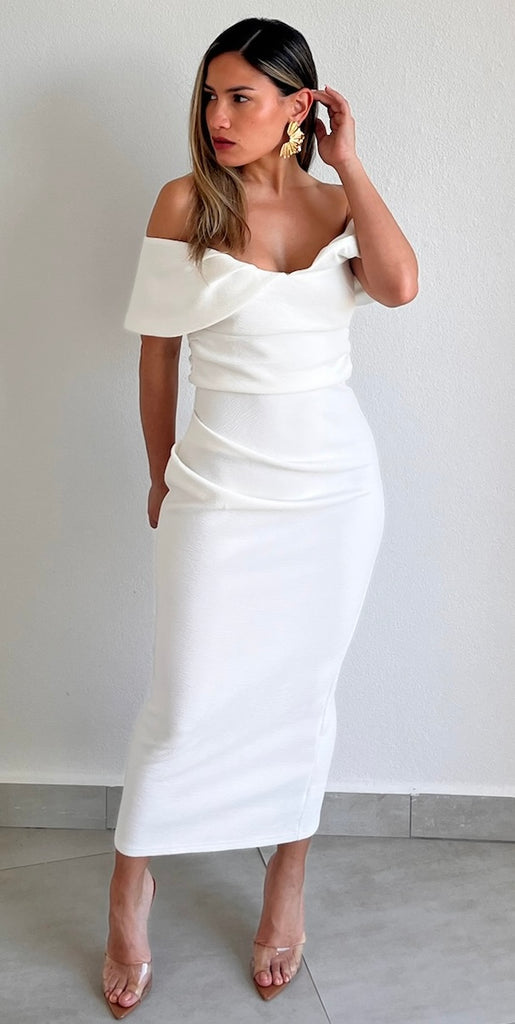 featuring Off-The-Shoulder Top Fitted at the Waist and Hips, Two Pleated Detail at the Hips and Midi Skirt in a Spandex Texture White Fabric.