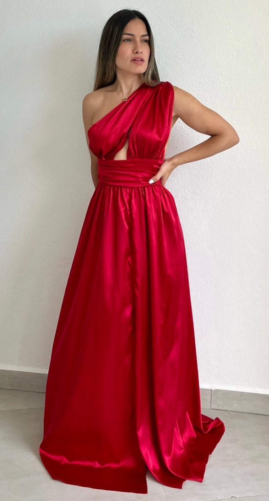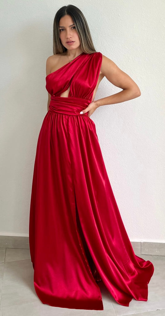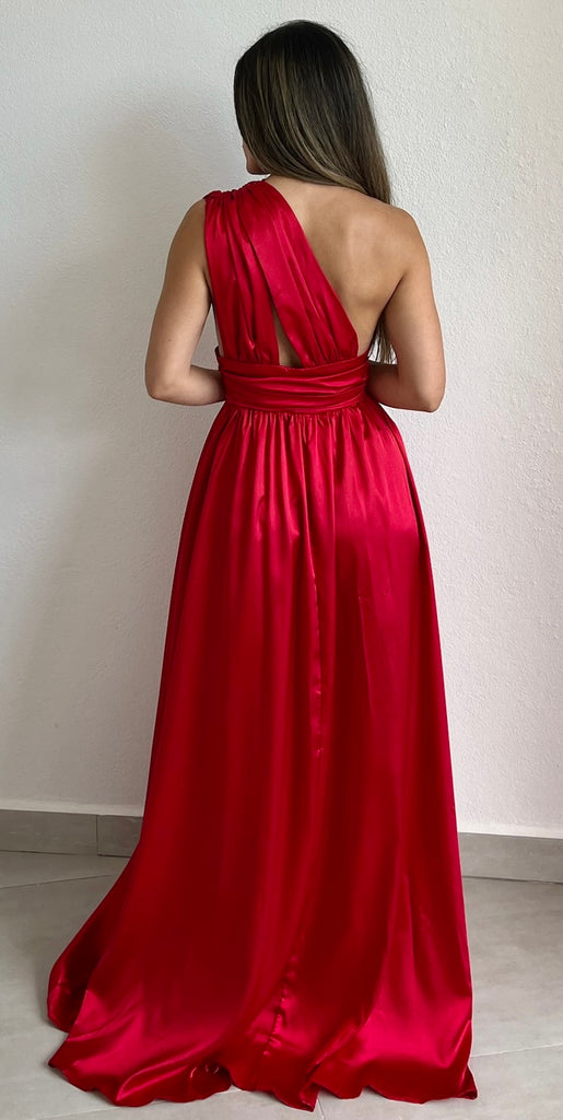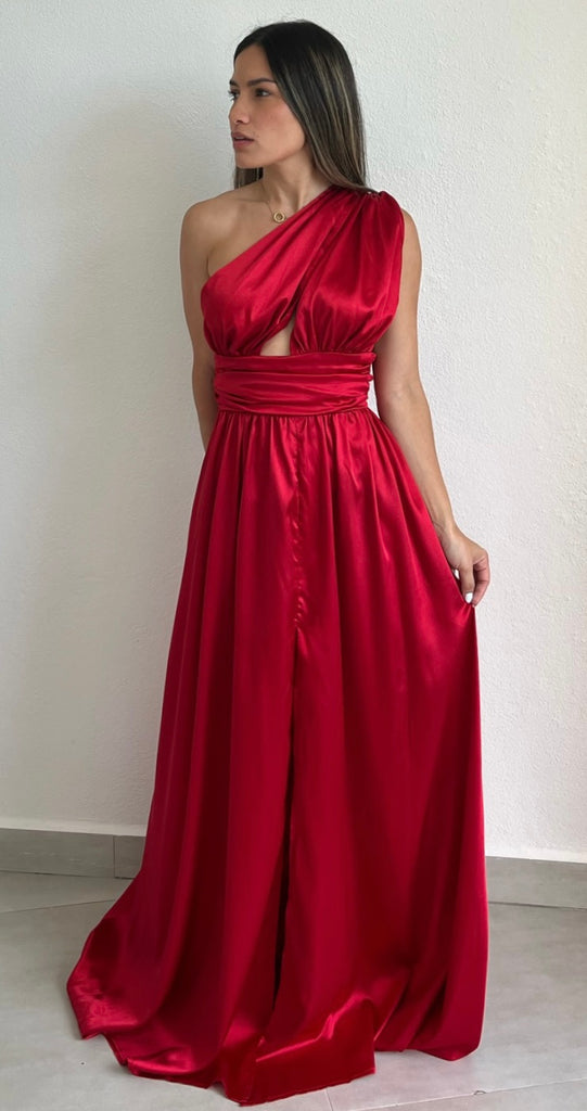 Gorgeous One-Shoulder Red Satin Maxi Dress