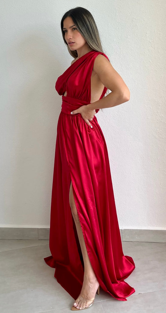featuring One-Shoulder Top Draped at the Bust, Back & Waist and Flare Long Skirt with Open Slit in a Soft Red Satin Fabric.