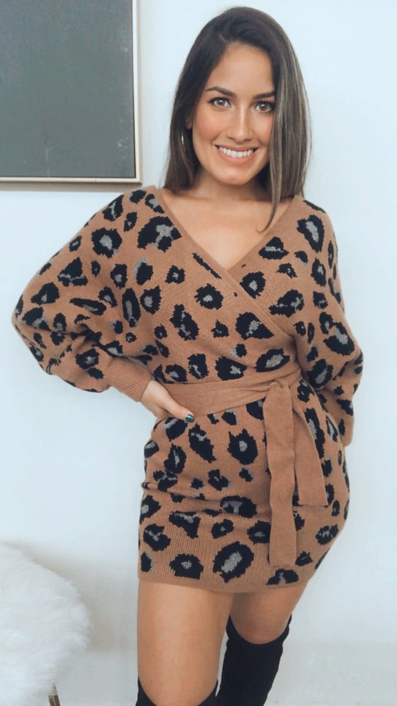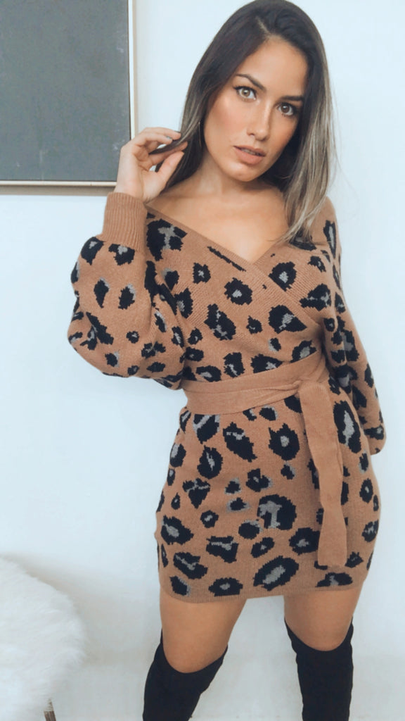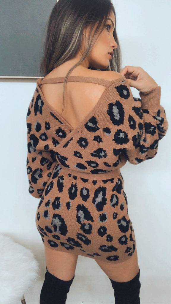 Lovely Off The Shoulder Leopard Print Sweater Dress